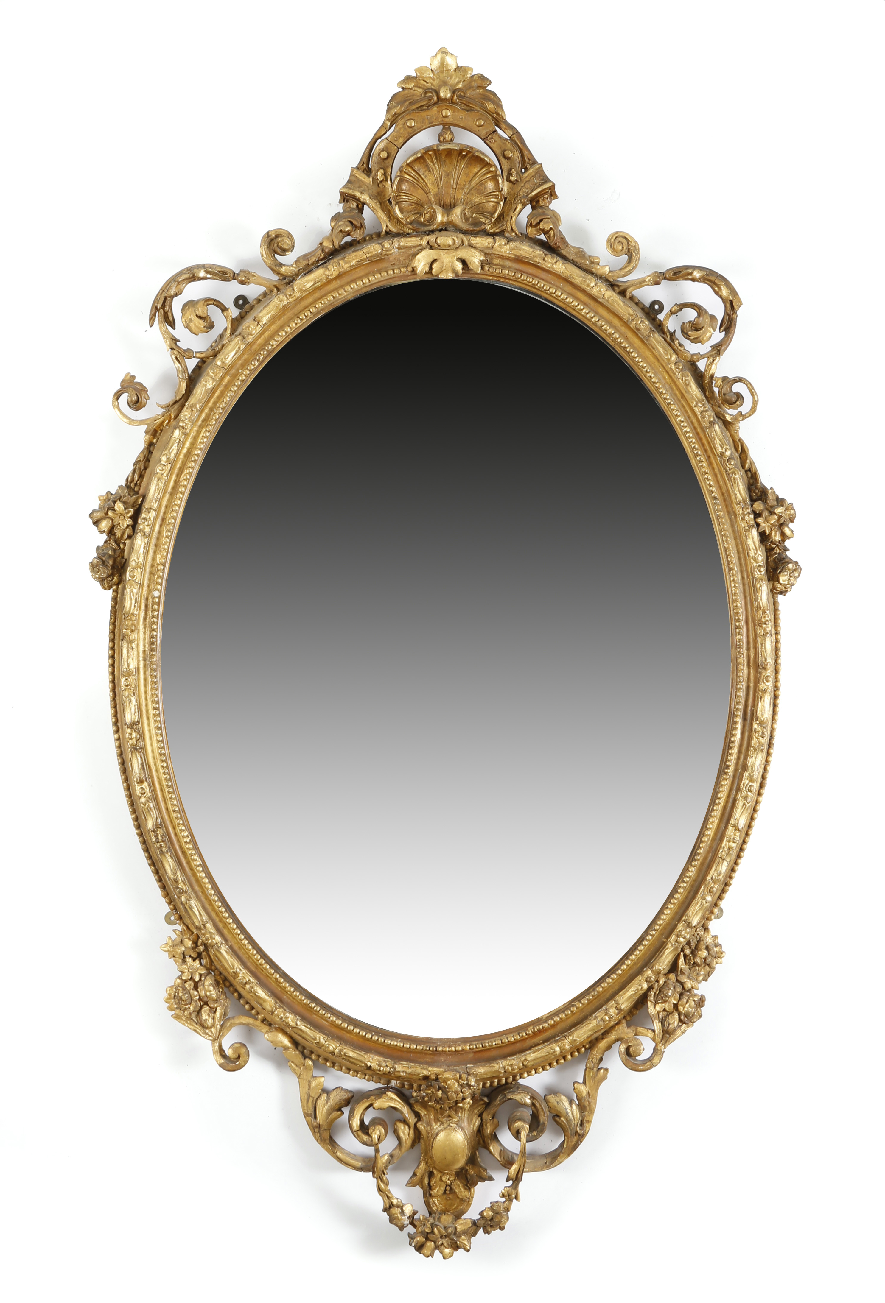 A VICTORIAN GILTWOOD AND GESSO WALL MIRROR C.1860 the oval plate within a beaded inner frame