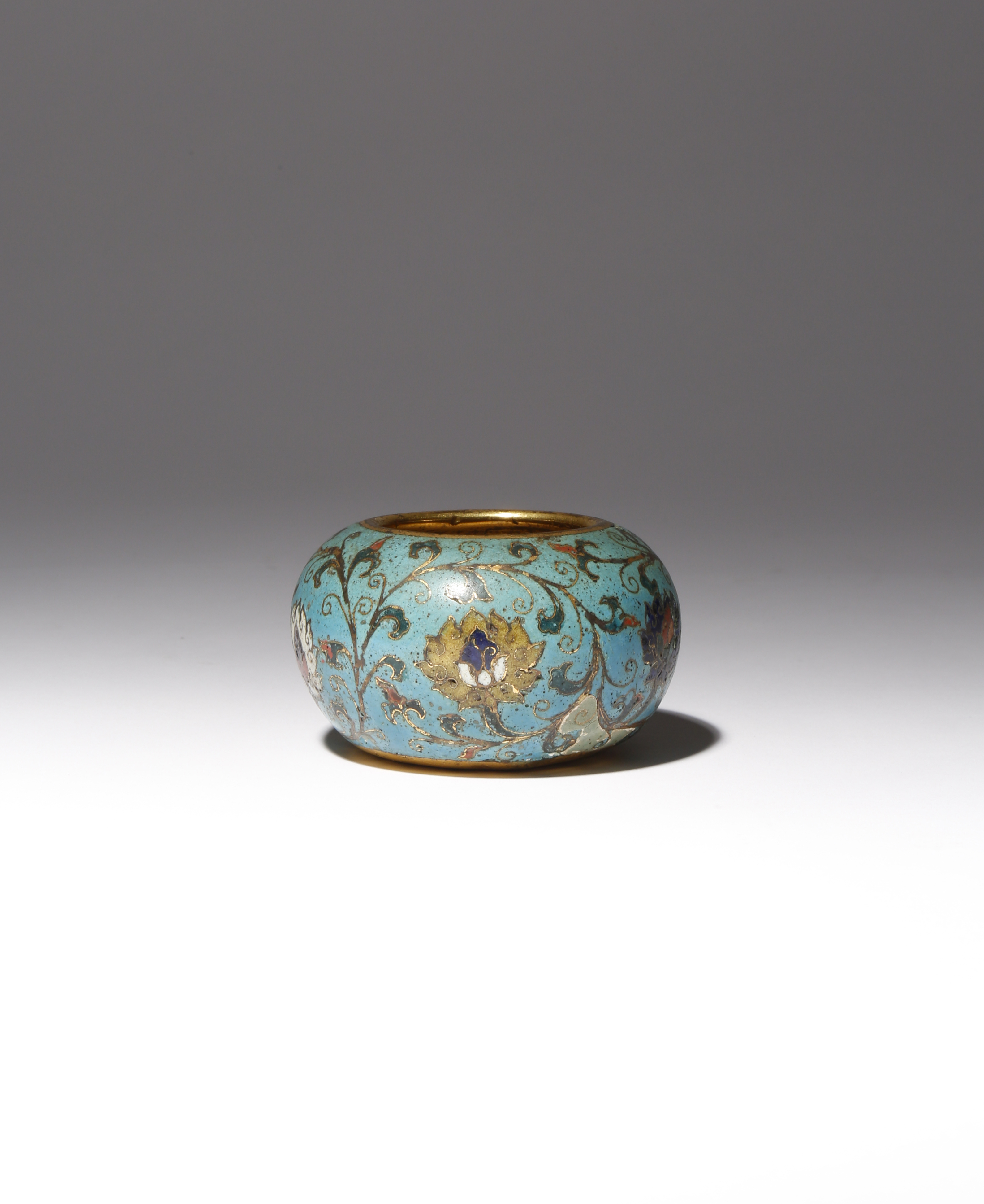 The compressed circular body decorated with large stylised lotus flowerheads growing amidst scrolling leafy tendrils, the design reserved on a turquoise ground, with gilt to the interior and the base, 6.5cm, 164g.
