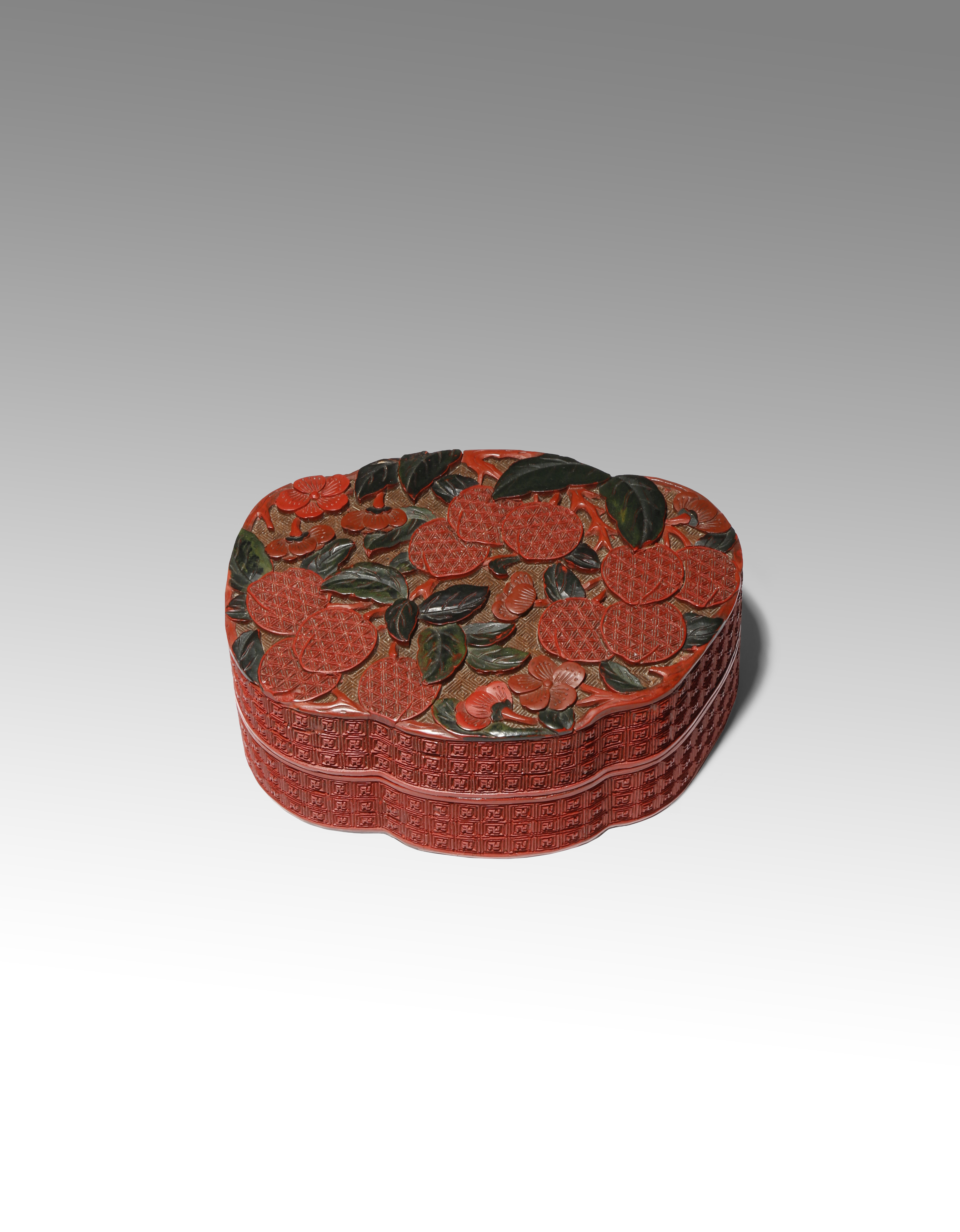 A CHINESE THREE-COLOUR CINNABAR LACQUER 'PEACHES' BOX AND COVER