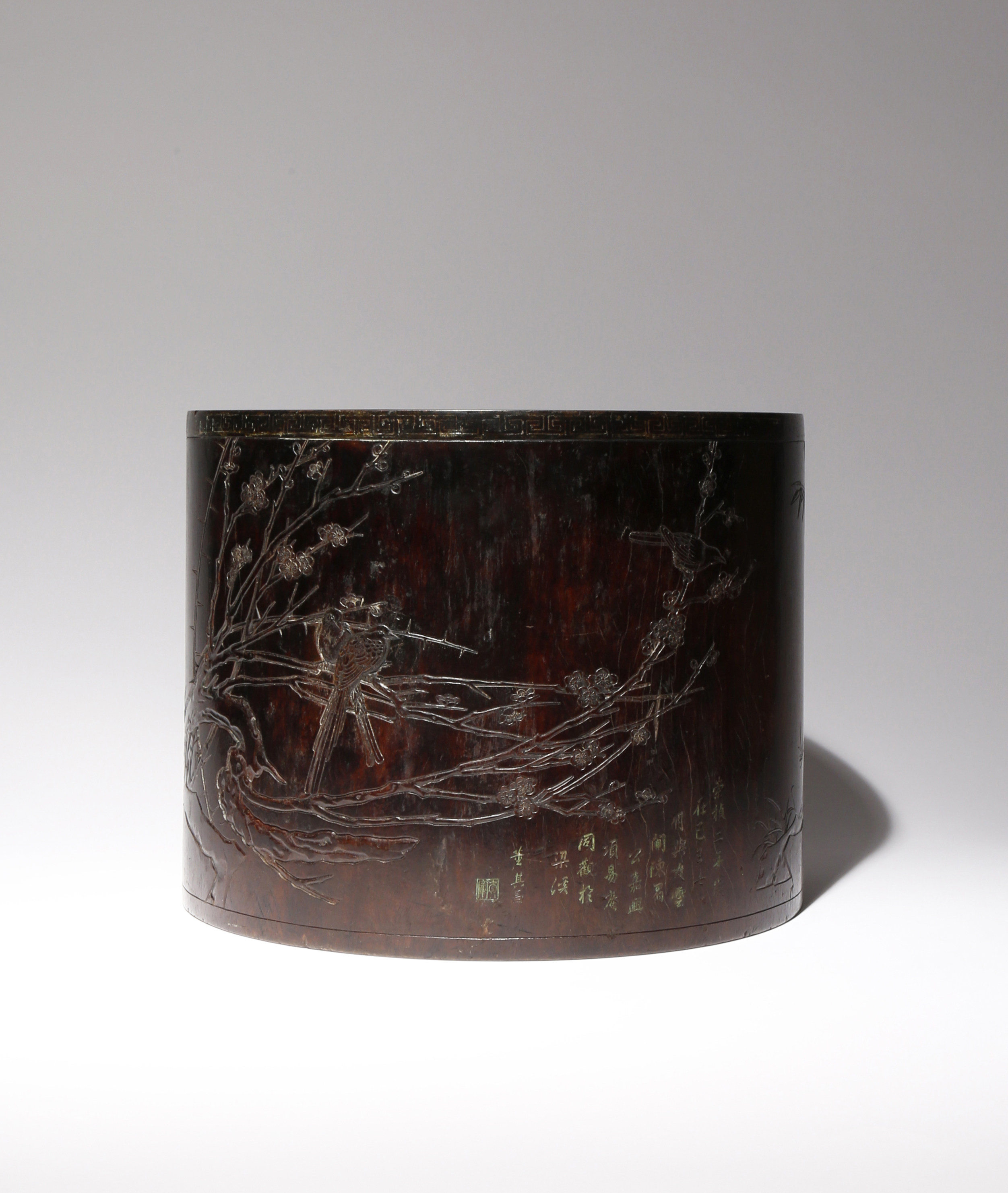 The cylindrical body carved in low relief with birds perched amidst prunus and bamboo in a rocky landscape, the rim encircled by a band of inlaid silver wire 'T' scrolls, with an inscription below describing the author with Chen Meigong and Xiang Yi'an admiring this piece at Liangxi, with a date for the second year of the Chongzhen Emperor's reign corresponding to 1630 and a signature reading Dong Qichang, 30cm dia.