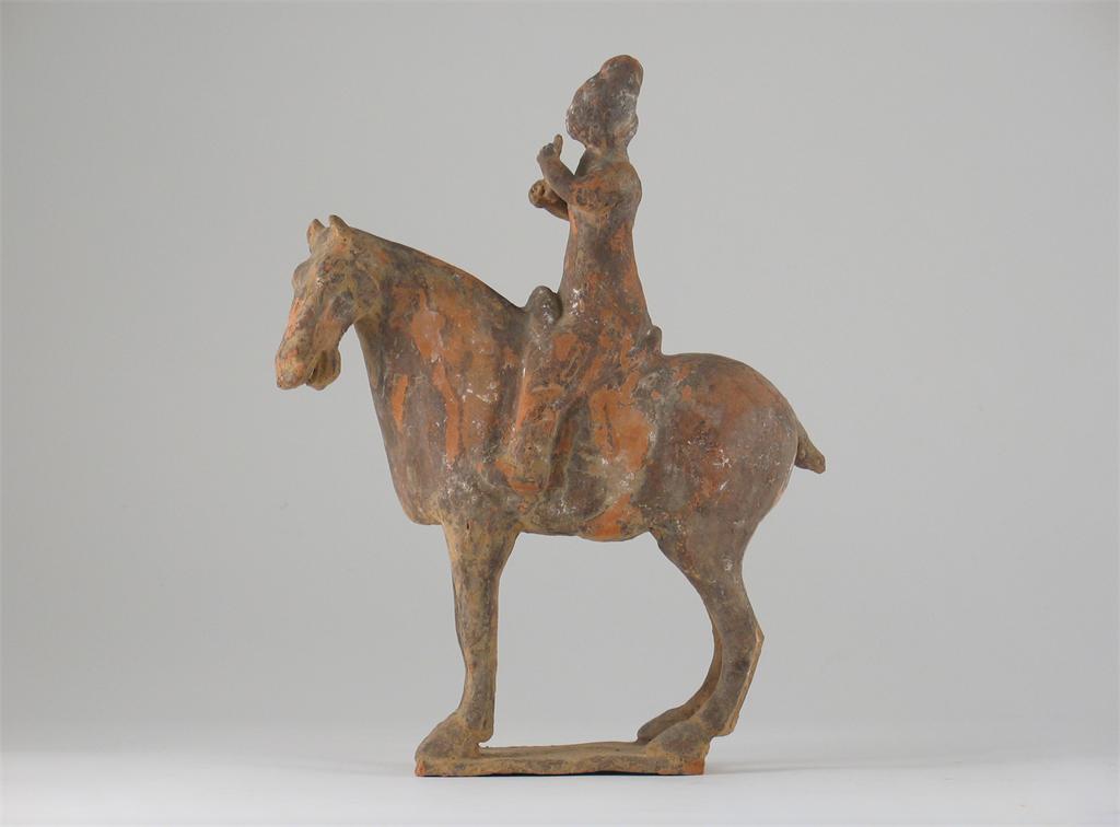A Chinese red pottery model of a horse and rider, standing four square on a rectangular base, probably Tang dynasty, 32cm.