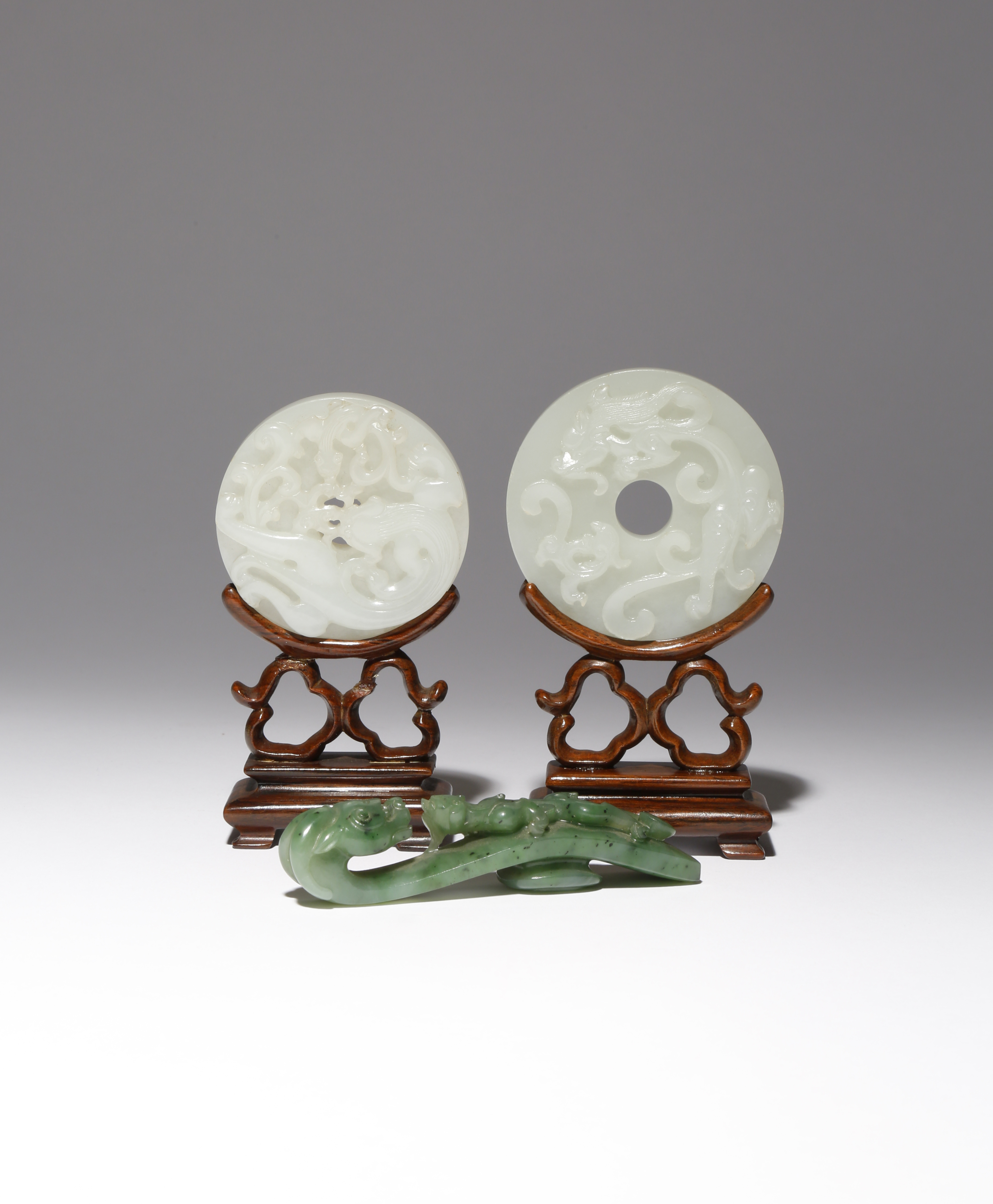One bi disc carved in relief with two sinuous chilong and lingzhi, the other decorated with a dragon and a small stylised phoenix, each with raised bosses to the reverse, together with wood stands, the belthook terminating in a dragon head and carved with a further beast crawling over the shaft, with dark specks distributed throughout the dark green stone, 9.1cm max. (5)