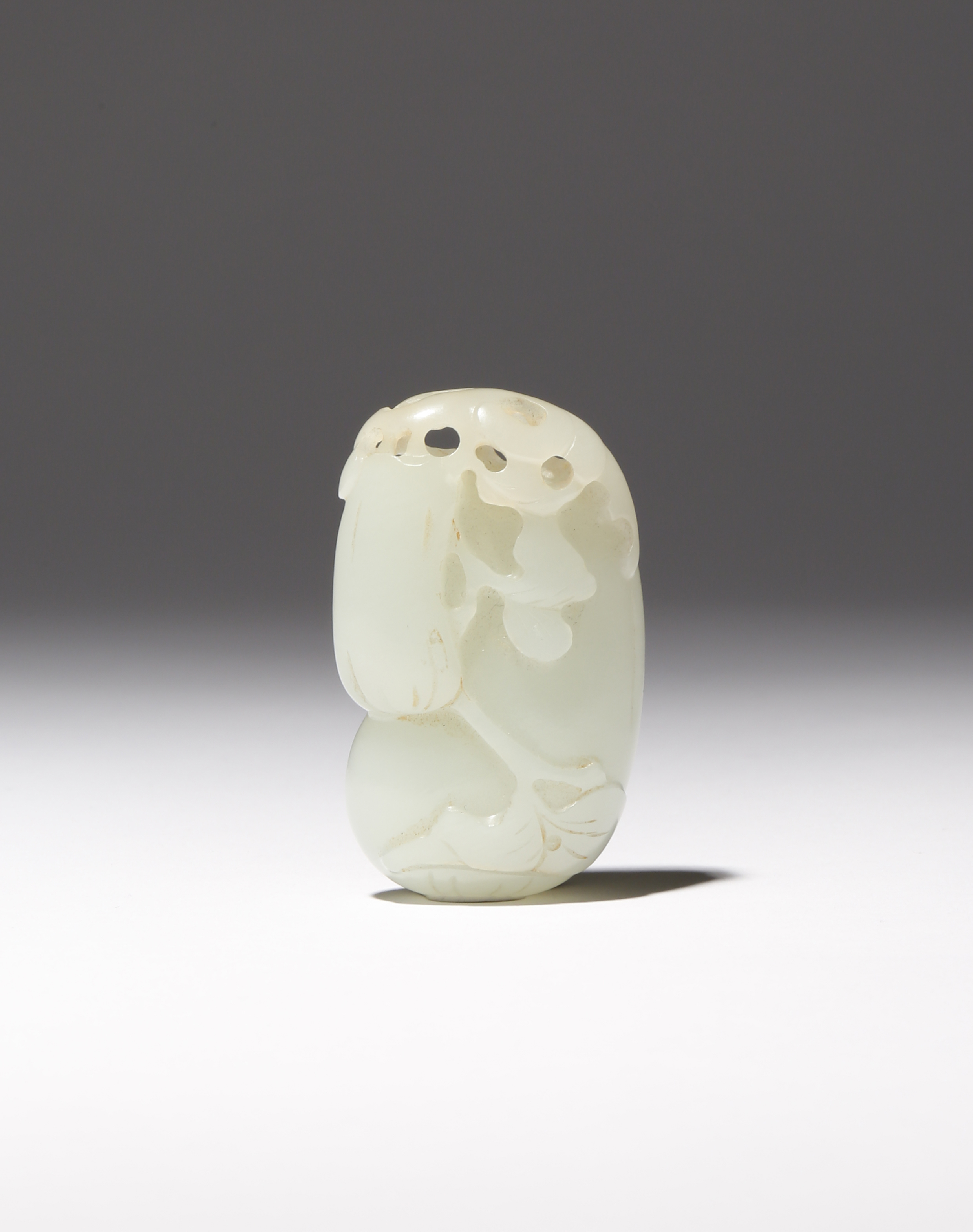 Carved as a large gourd growing from a leafy branch which also issues a smaller fruit and trailing vines, the stone of a pale even tone, 5.1cm.