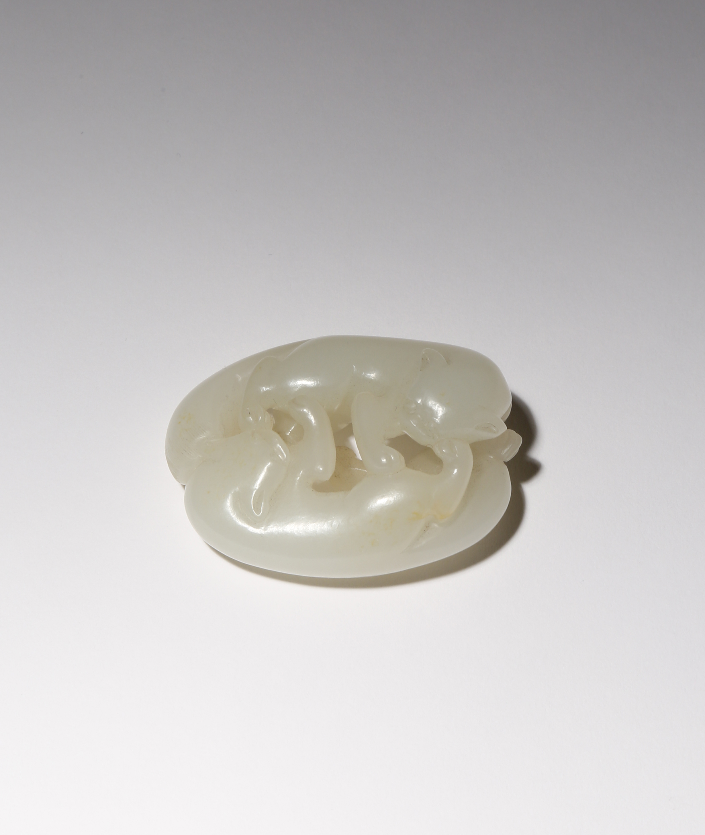 Of oval form, carved in openwork with two feline-like badgers, the animals recline together gazing back at each other, with finely incised hairs to the ends of their curled tails, the pale stone with some small russet markings, 5.1cm.