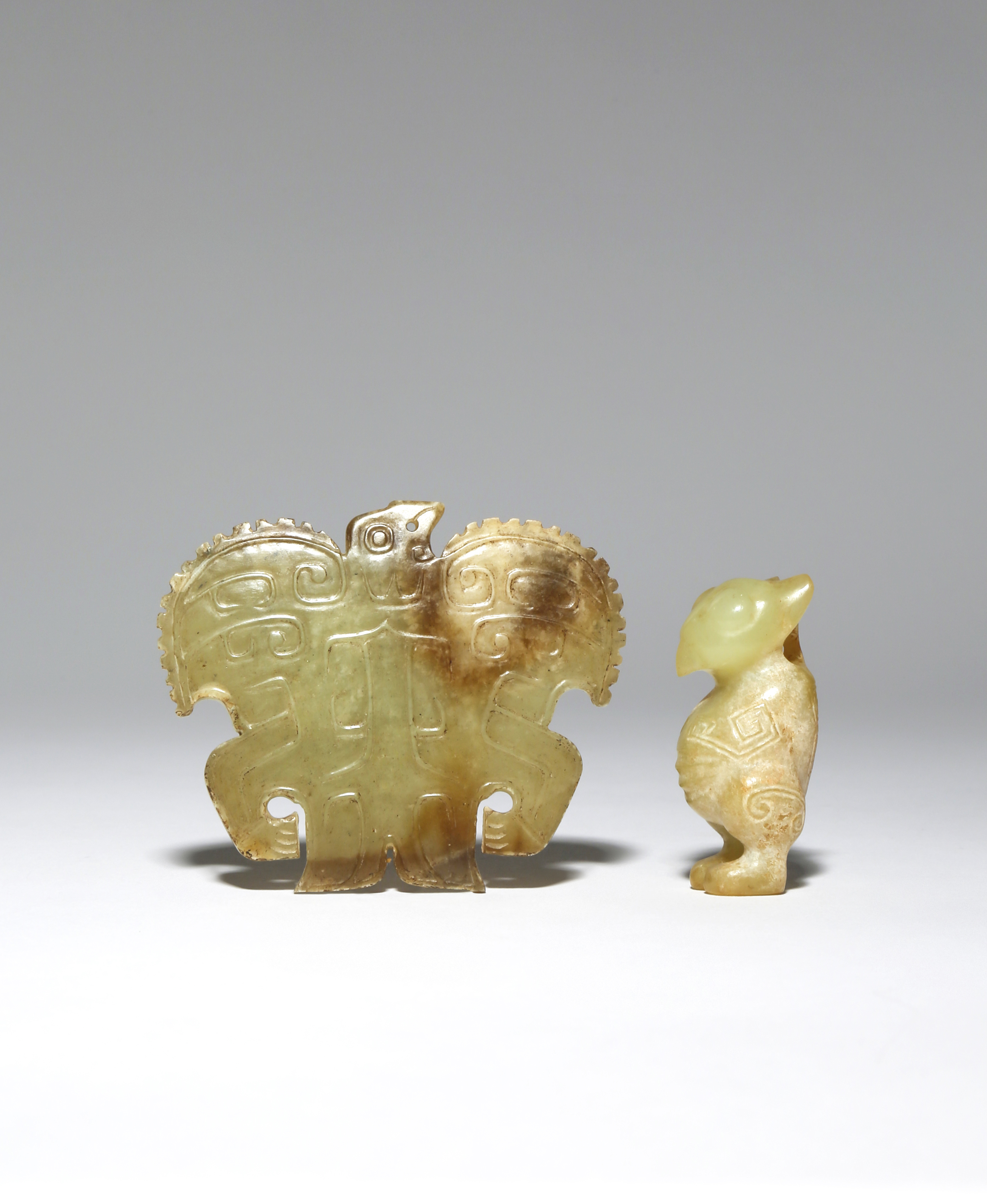 One carved as an owl standing upright with its ears pricked up, the other of flattened form and shaped as a stylised eagle spreading its wings, the birds decorated in shallow relief with scrolling motifs, each with calcification to the stone, 5cm and 7.5cm. (2)