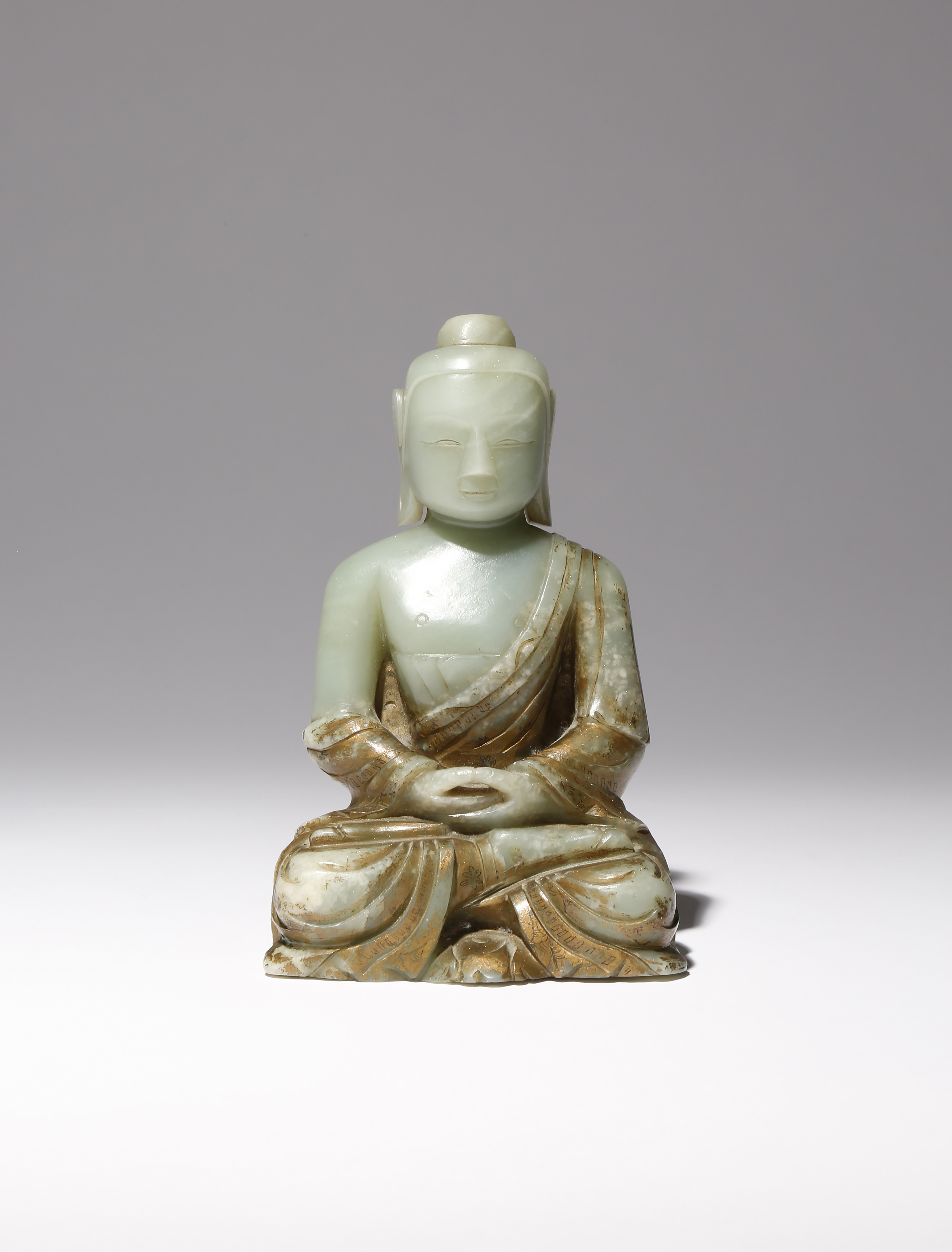Carved seated in dhyanasana with his hands in dhyana mudra, his robes picked out in gilt and decorated with blossoms, the garments draped loosely over his shoulder revealing his bare chest, his sharply defined features framed by his large elongated earlobes, the stone with some white inclusions, 16.8cm.