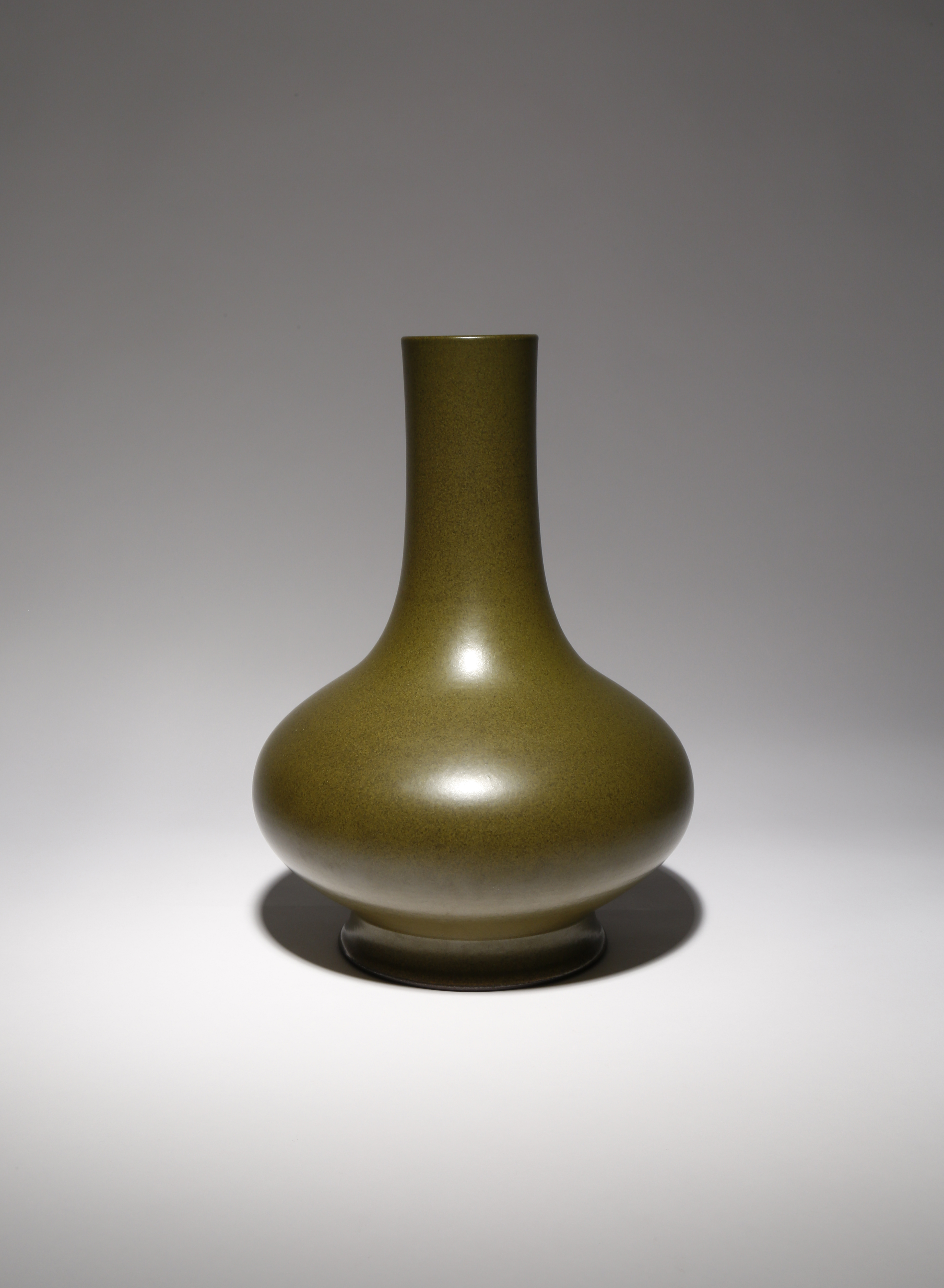 The pear-shaped body surmounted by a tall cylindrical neck, decorated all over with a dark olive-coloured mottled glaze, all raised on a flared foot, the incised reign mark contained within a slightly recessed square covered with a brown wash, 33.4cm.