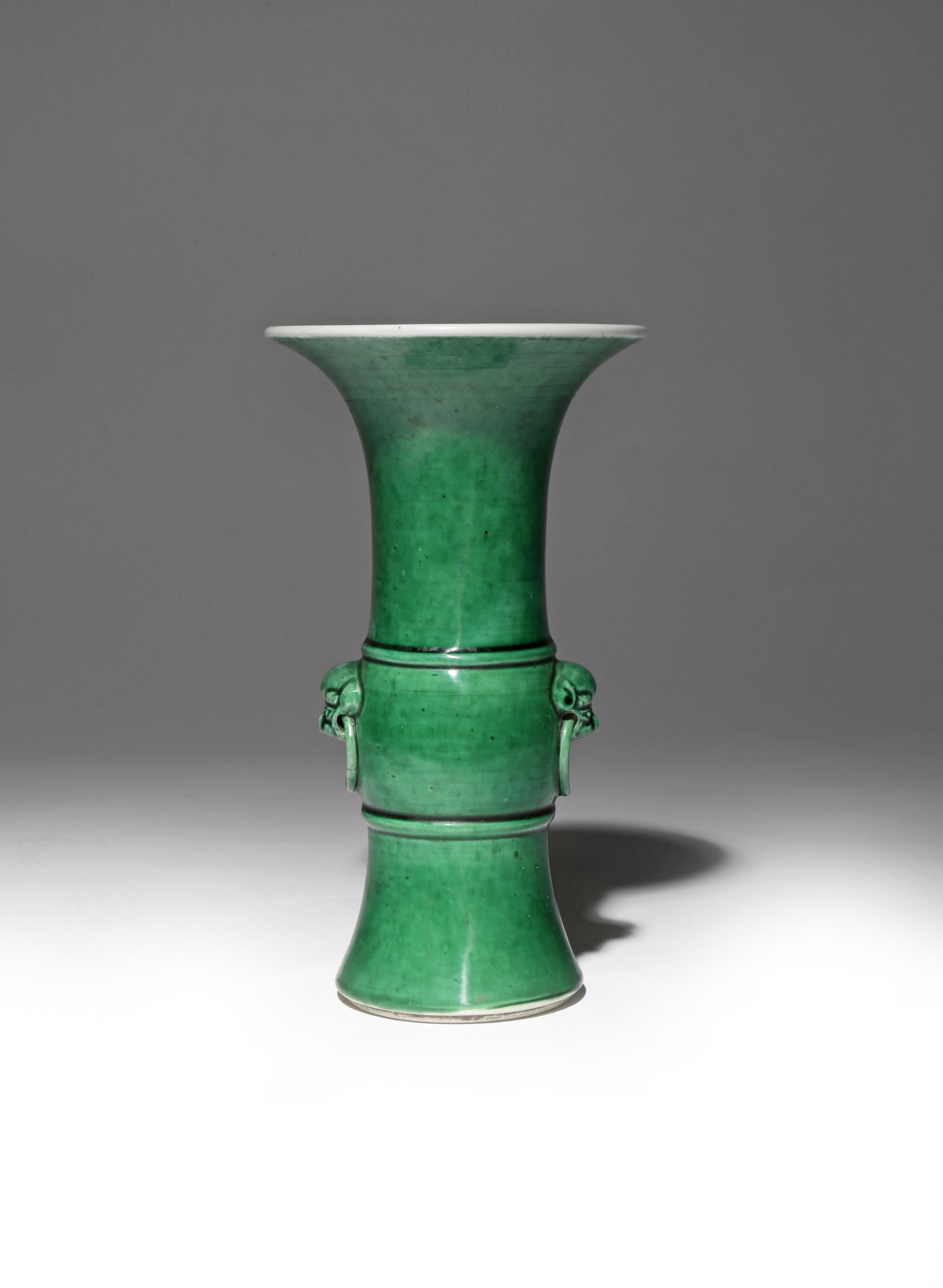 Rising from a spread foot to a tall flaring neck, the central section flanked by two applied animal masks suspending rings from their mouths, with a vibrant green glaze decorating the body, the rim left white, with the reign mark incised to the base, 18cm.