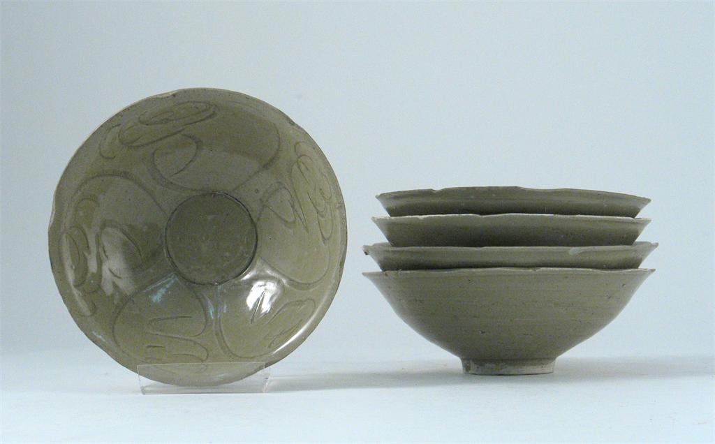 Five Chinese celadon bowls, with foliate rims and incised with stylized designs, Song/Yuan dynasty, 18cm. (5)
