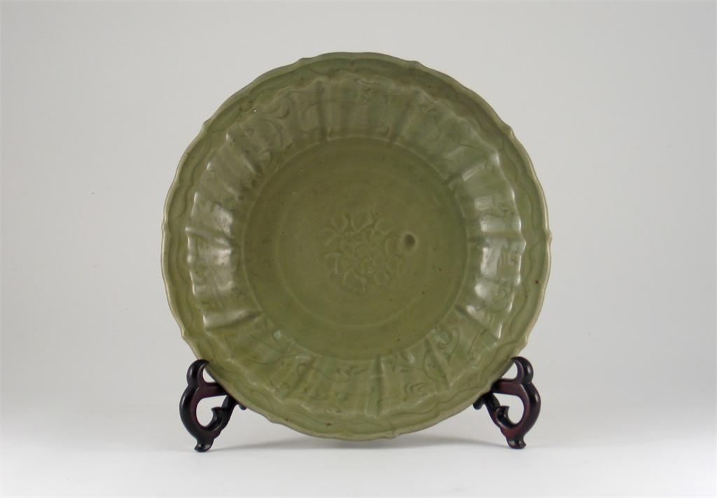 A Chinese Longquan celadon lotus-shaped dish, moulded with flutes and carved with stylized foliage, early Ming dynasty, 34.5cm.