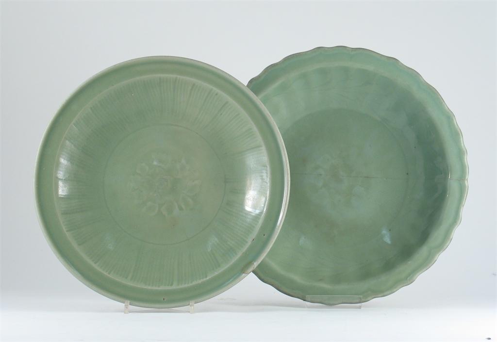 Two Chinese Longquan celadon dishes, moulded with flowerheads. Both damaged. Early 15th century, 32cm. Max. (2)