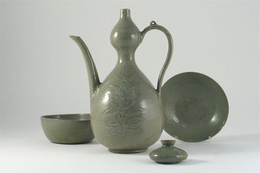 A Korean celadon glazed ewer, carved with lotus, two celadon bowls and a small jar. Damages. 19th century and earlier, 29cm. Max. (4)