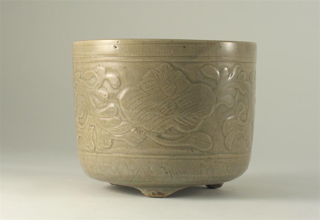 A Chinese celadon glazed censer, carved and moulded with a continuous peony scroll. A little damage to the rim. probably Ming dynasty, 16cm.