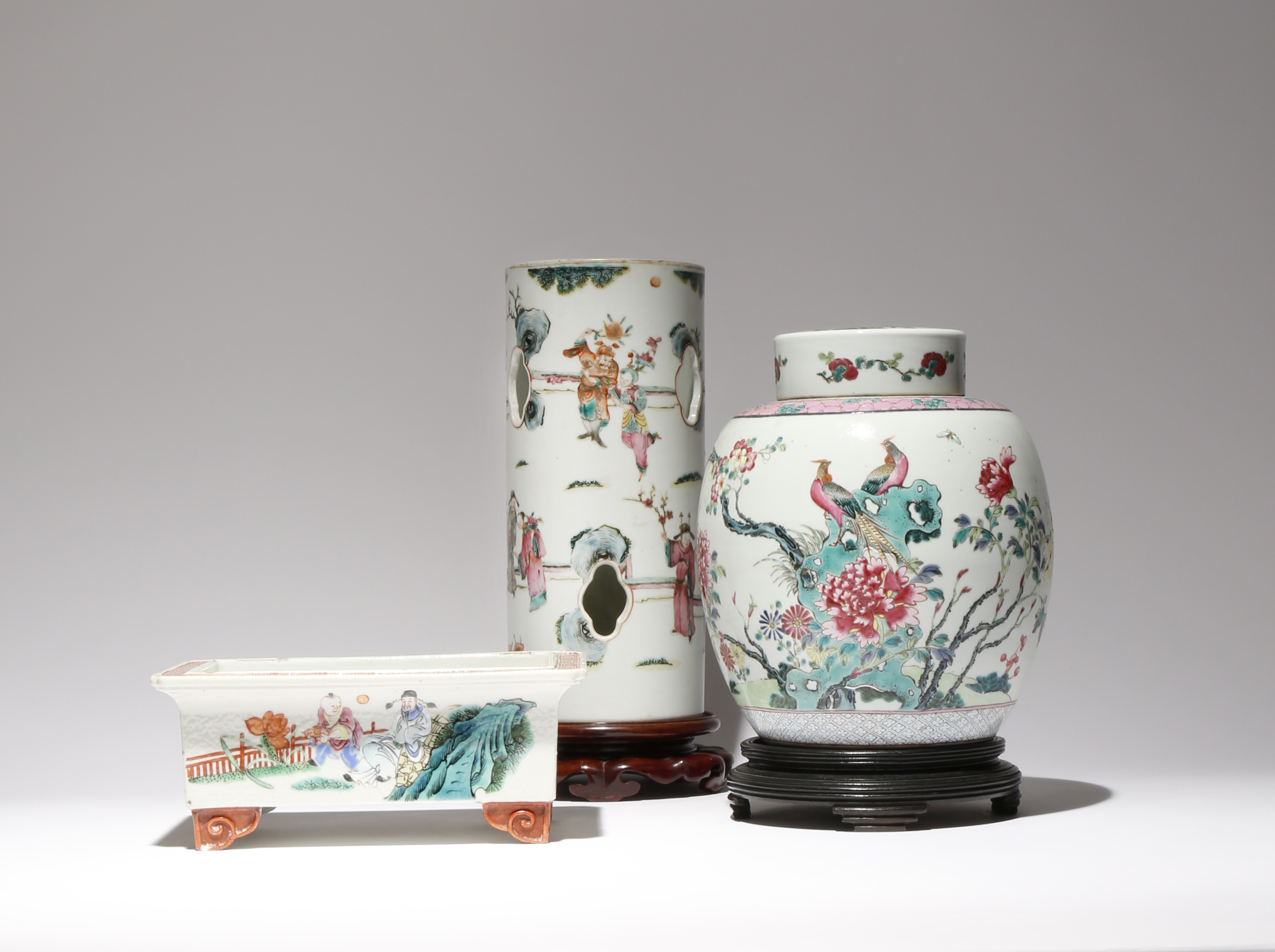 Comprising: a tall cylindrical hat stand painted with figures holding flowering branches in a garden, with six pierced quatrefoil panels, an ovoid vase and cover decorated with pheasants amidst rocks, peony and prunus, with smaller birds in flight to the reverse, and a rectangular-section jardinière painted with scholars and their attendants, the base with a six character Daoguang mark, two with wood stands, 28.5cm max. (6)