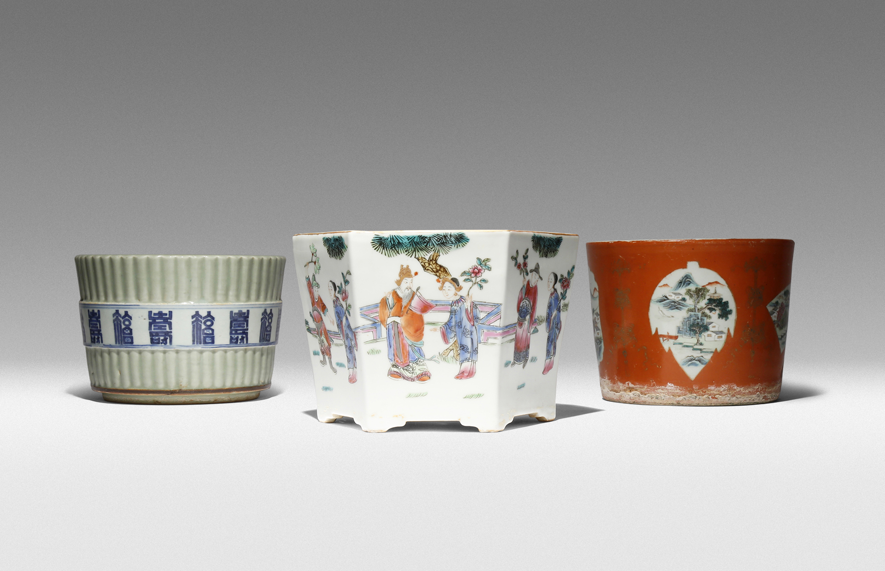One decorated with a blue and white band of the characters fu shou repeating, the design reserved on a moulded celadon glazed ground, another painted with variously shaped panels enclosing landscapes against a gilt-decorated coral ground, the third of hexagonal section and painted in the famille rose palette with figures in a garden, 25.5cm max. (3)