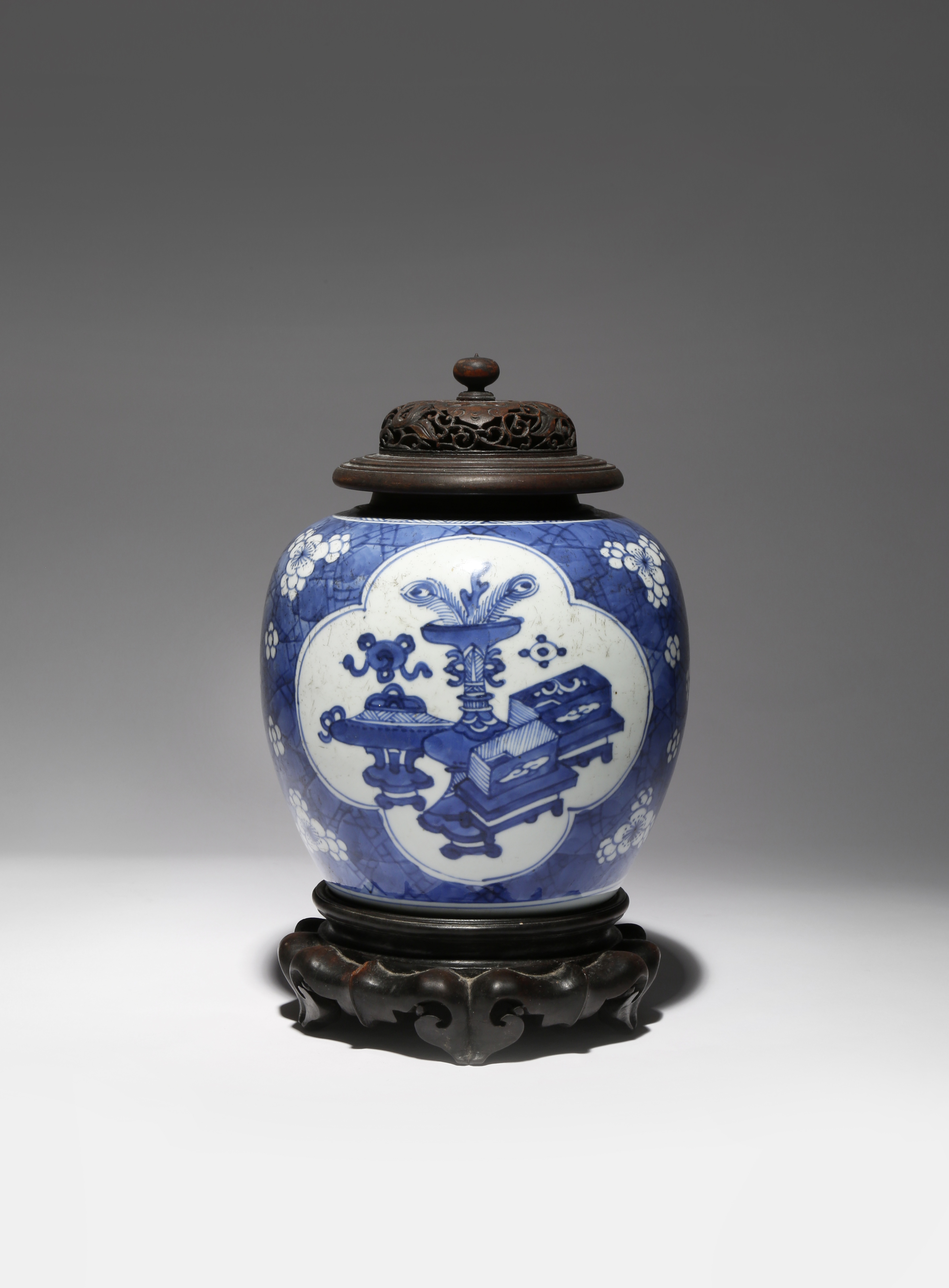 Painted with two quatrefoil cartouches enclosing various precious objects including archaistic vessels, peacock plumes, a qin and books, the panels reserved on a prunus-decorated cracked-ice ground, together with a wood stand and an openwork wood cover, 16.8cm. (3)