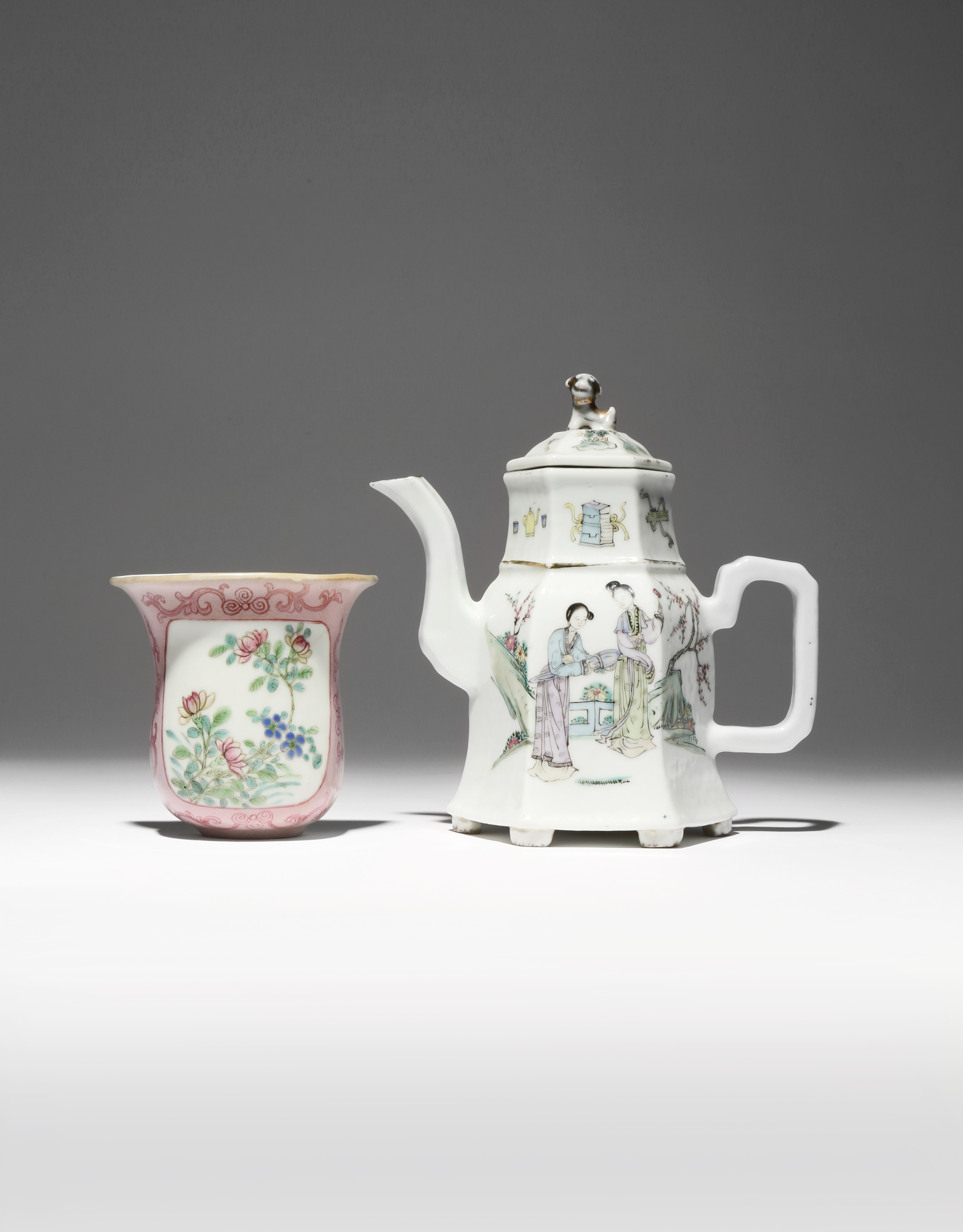 A CHINESE FAMILLE ROSE WALL VASE AND A HEXAGONAL-SECTION TEAPOT AND COVER