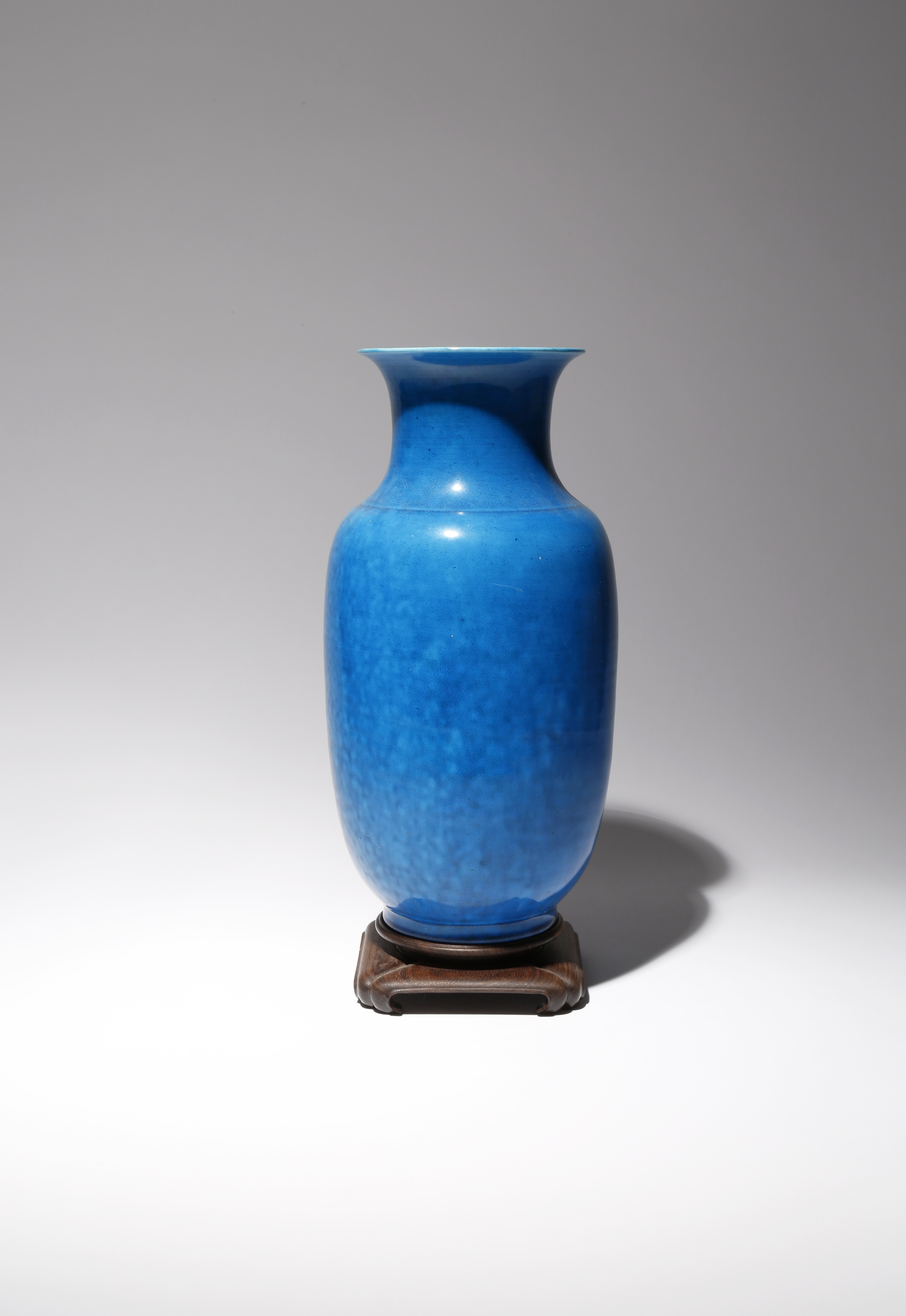 The ovoid body surmounted by a short waisted neck, decorated all over with a vibrant turquoise crackled glaze, together with a wood stand, 34.5cm. (2)