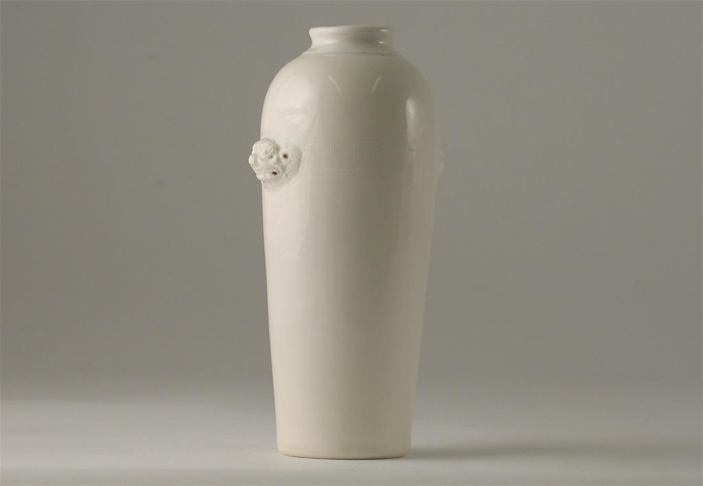 A Chinese blanc de Chine cylindrical vase, with lion mask handles and an incised band of key fret, probably 19th century, 17cm.