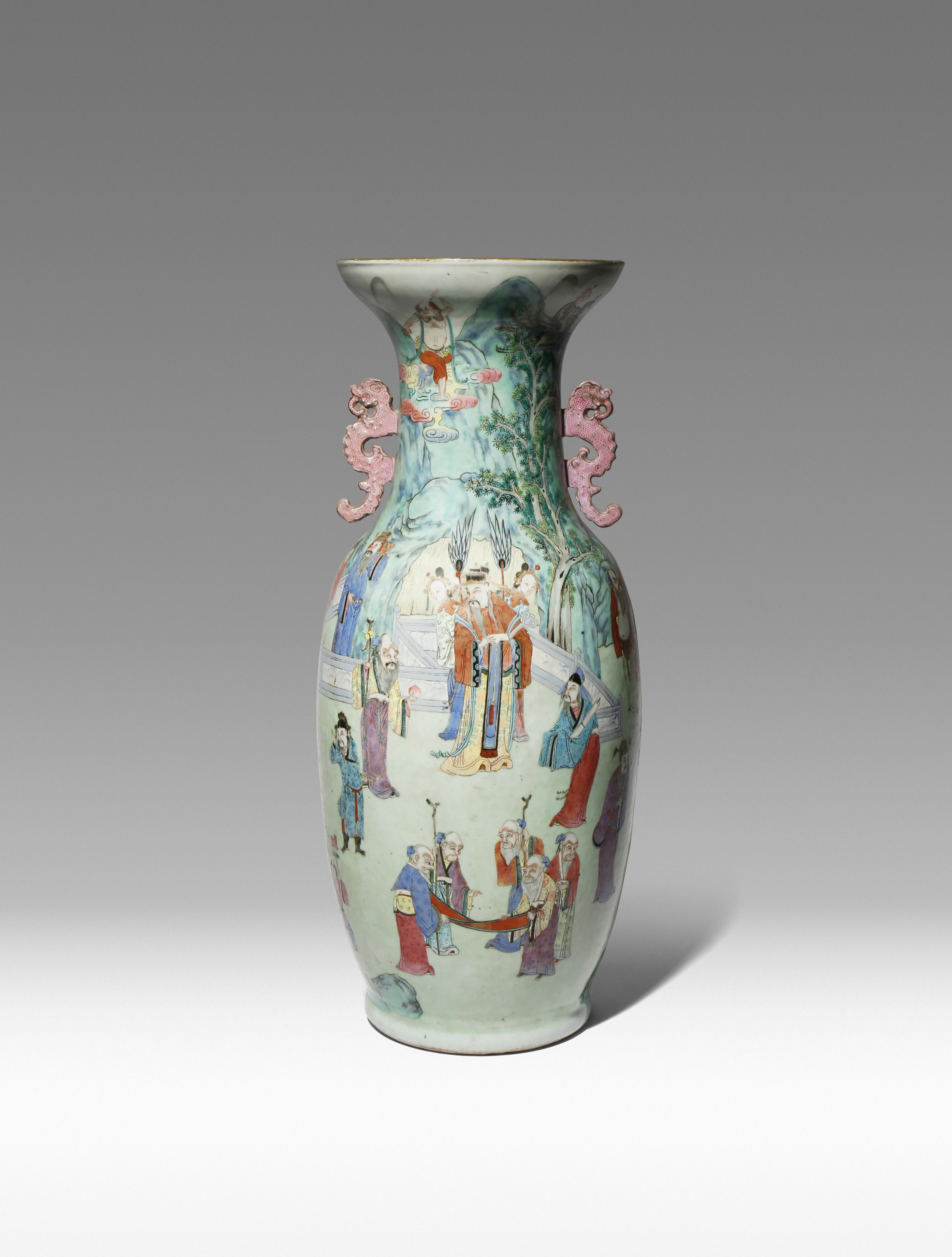 Brightly painted with a continuous scene of many heavenly figures in a mountainous paradise, the deities including Shoulao, the Hehe Erxian and Liu Hai, with two pink-enamelled applied handles shaped as archaistic beasts flanking the neck, 61cm.