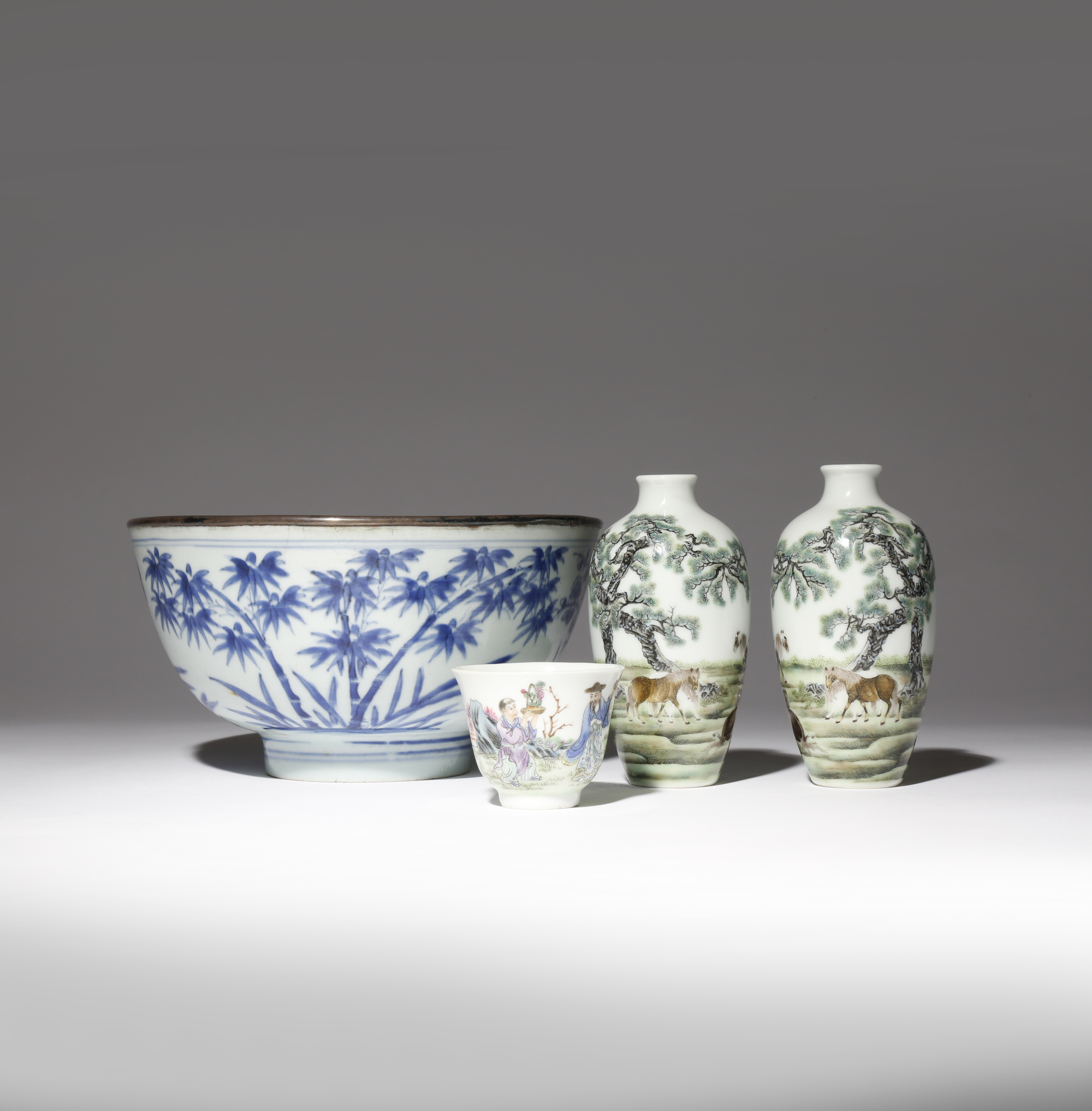 Comprising: a blue and white bowl decorated with the Three Friends of Winter, with a metal band to the rim and a six character Xuande mark to the base, a pair of Republic Period vases decorated with horses and calligraphy, the bases with four character Qianlong marks, and a small enamelled wine cup painted with two figures in a garden, with a hall mark to the base, 20.2cm max. (4)