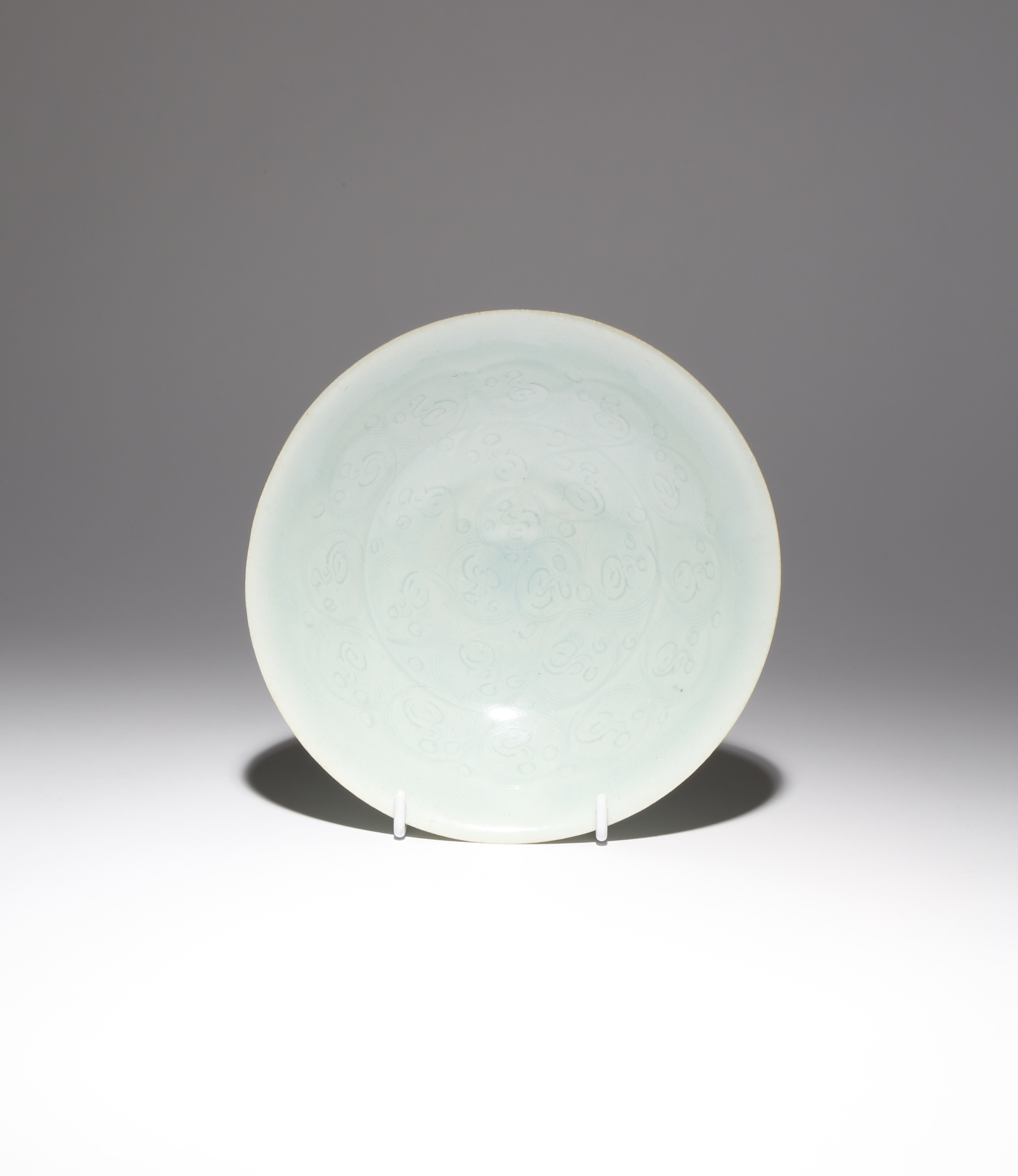 Rising from a tapering foot to a gently flaring rim, the interior incised with twenty-two roundels enclosing stylised scrolls, decorated in a pale blue glaze which pools around the foot, the base left unglazed, 18.5cm.