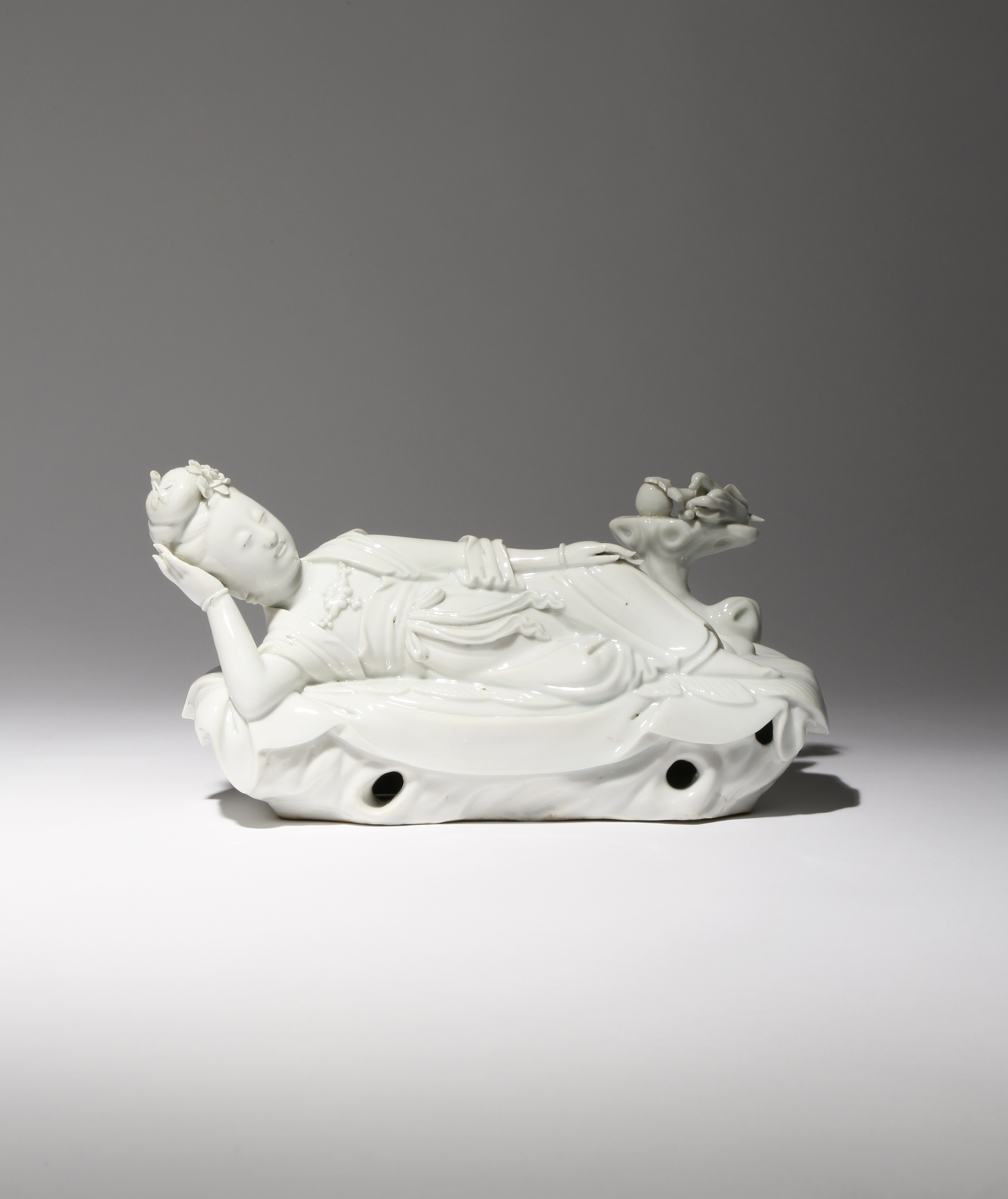 Depicted reclining on a large plantain leaf upon a pierced rockwork base, she rests her head on one hand, with her hair piled in a chignon and adorned with blossoming flowers, a rocky table at her feet supports a finger citron and smaller fruit, 23.5cm.