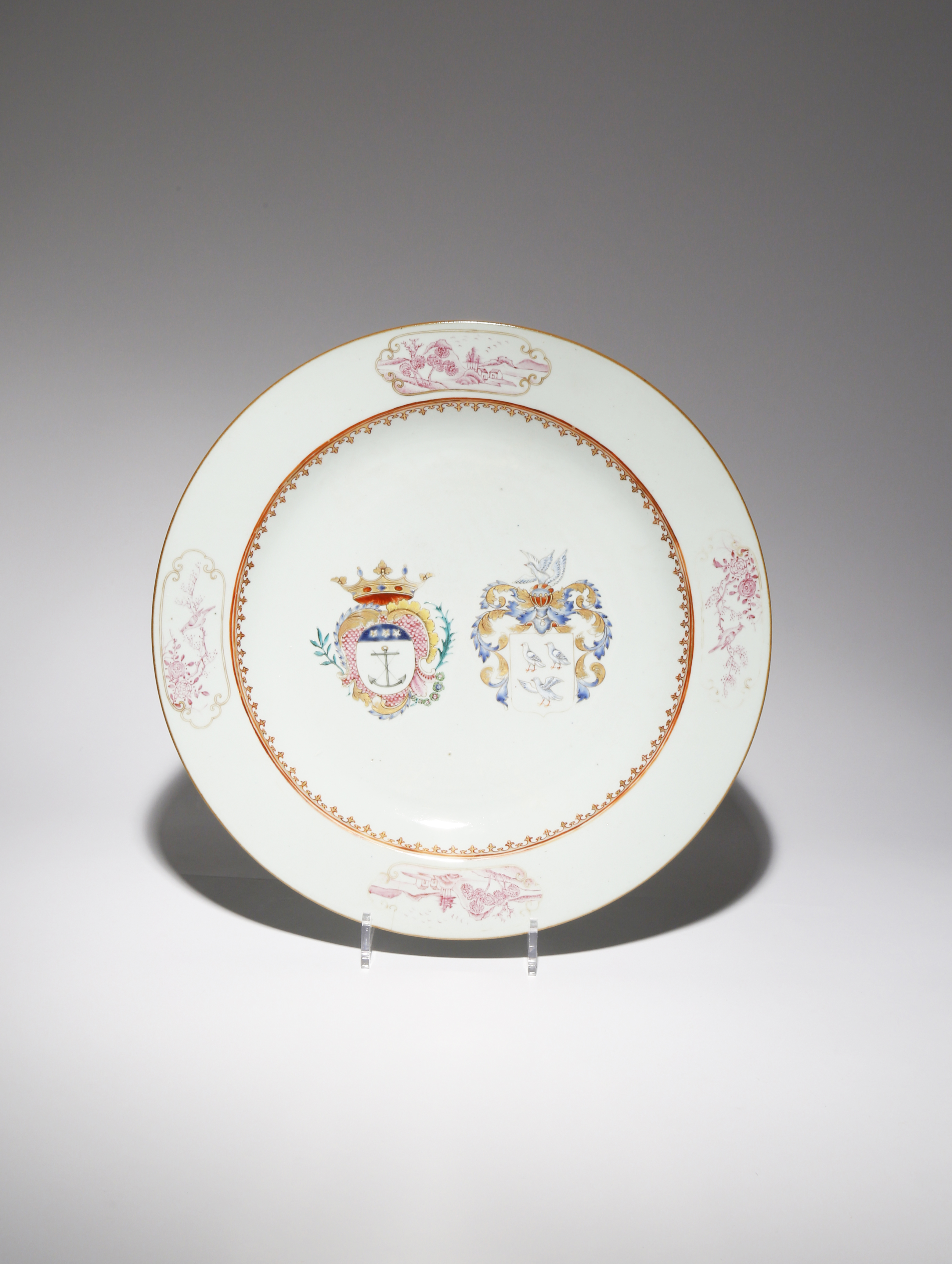 A LARGE CHINESE FAMILLE ROSE ARMORIAL 'MARRIAGE' DISH FOR THE DUTCH MARKET