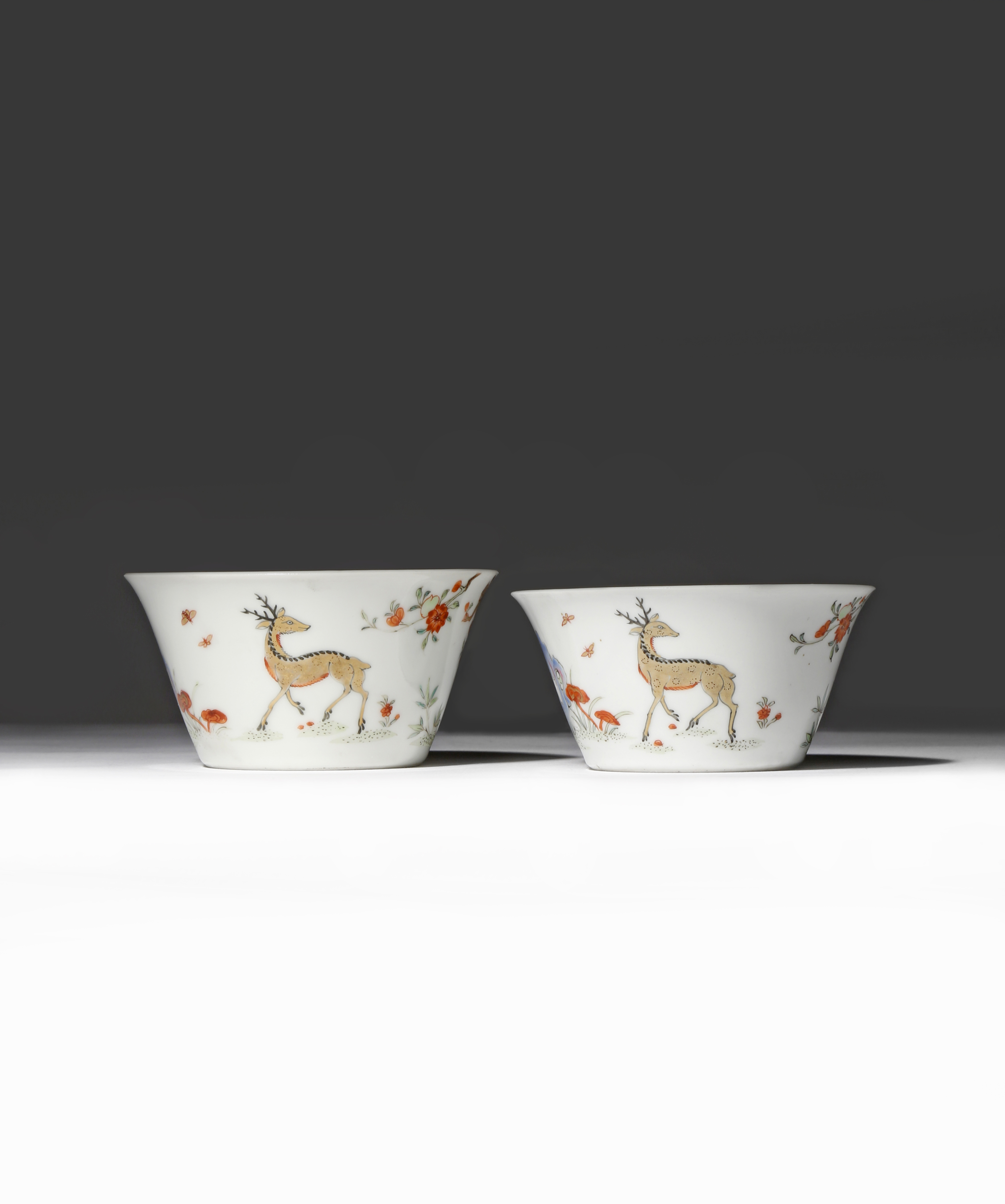 A NEAR PAIR OF CHINESE ENAMELLED 'DEER AND MONKEY' TEA BOWLS