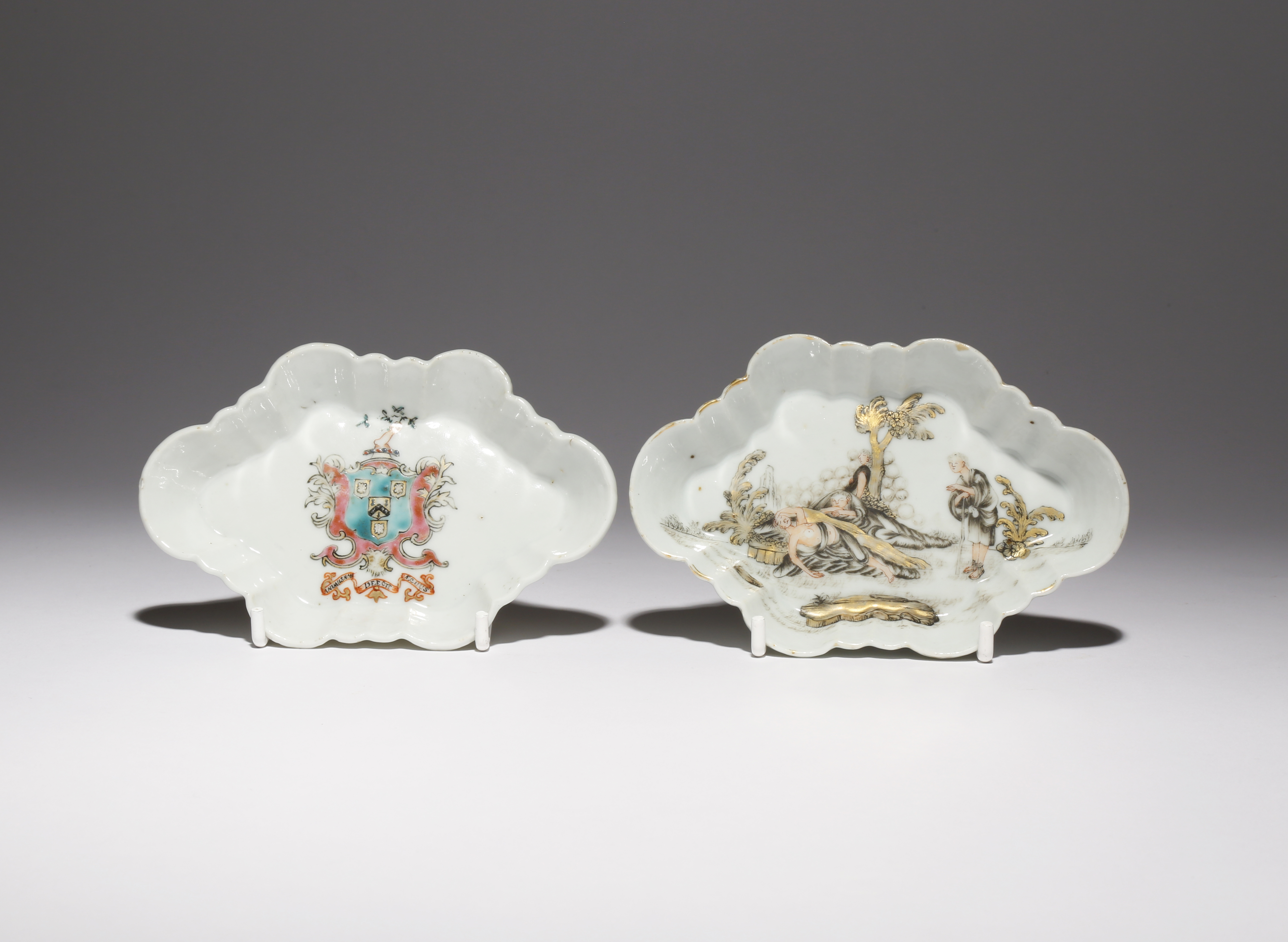 One decorated en grisaille with the 'Lamentation of Christ', the base with a paper label for the Hervou‡t Collection, no.369, the other painted in enamels and gilt with the arms of Burrell in pretence Lewis?, 12.9cm and 12.6cm. (2)
