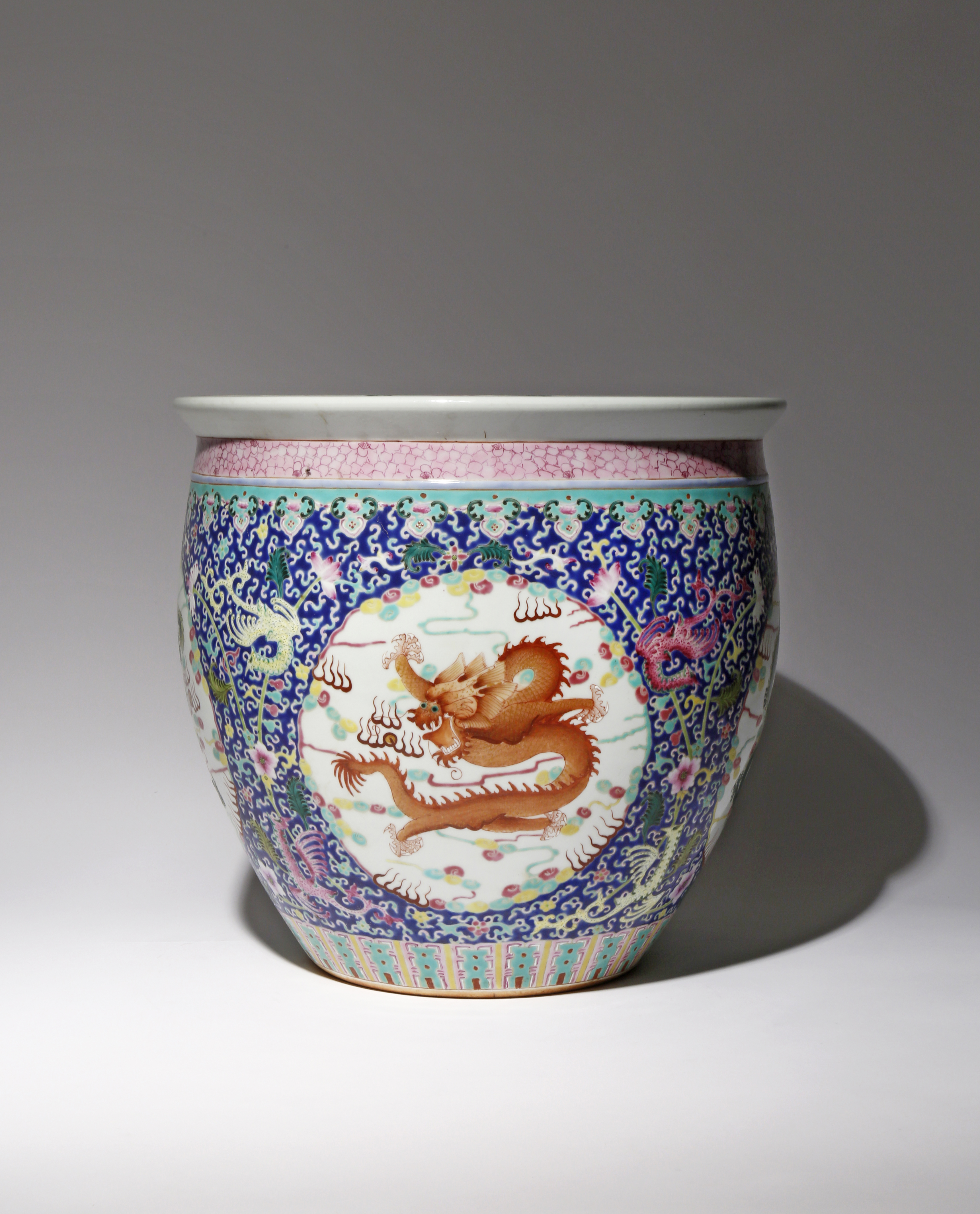 A LARGE CHINESE FAMILLE ROSE BLUE-GROUND 'DRAGON AND PHOENIX' JARDINIERE