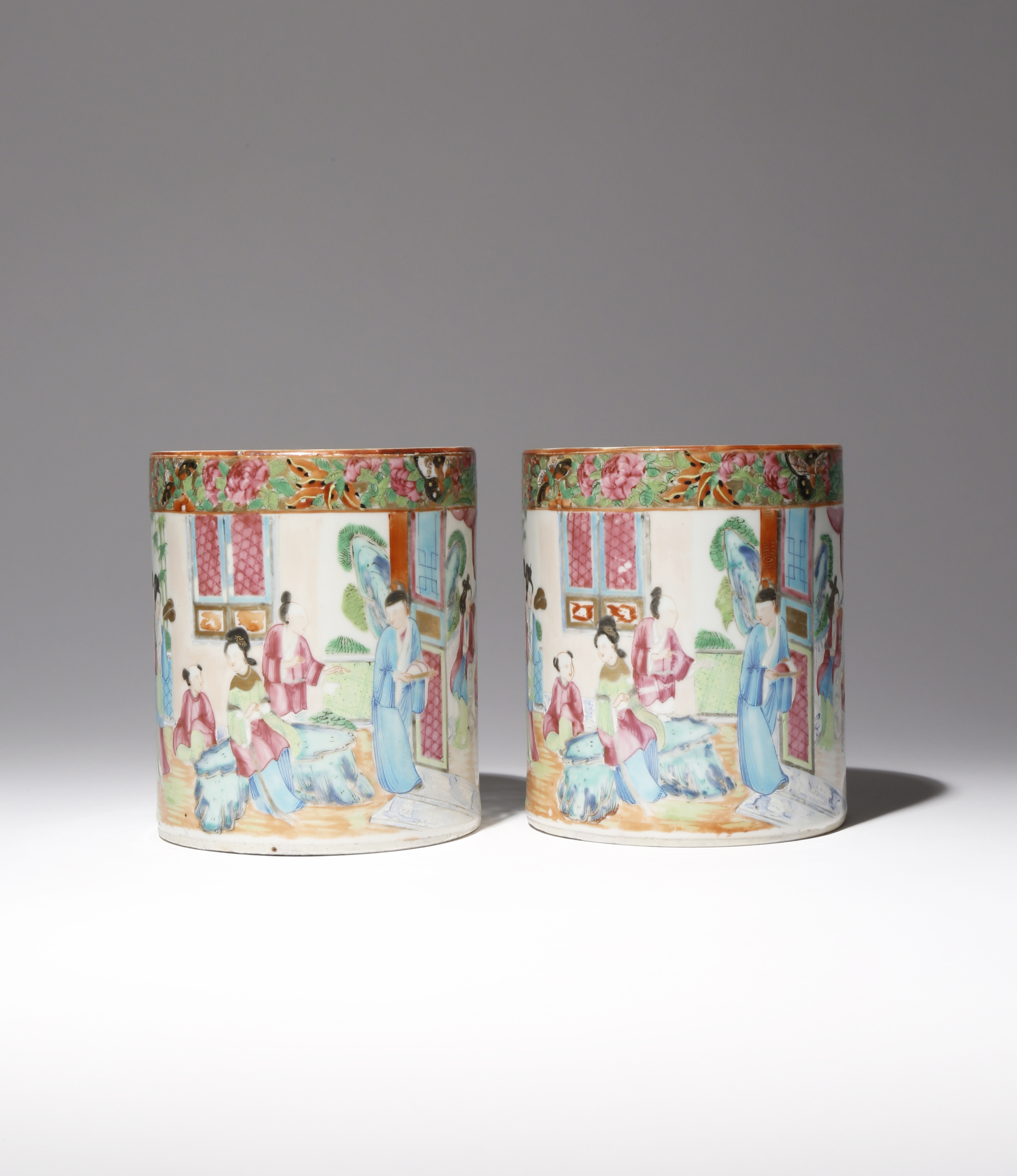A PAIR OF CHINESE CANTON FAMILLE ROSE CYLINDRICAL BRUSHPOTS