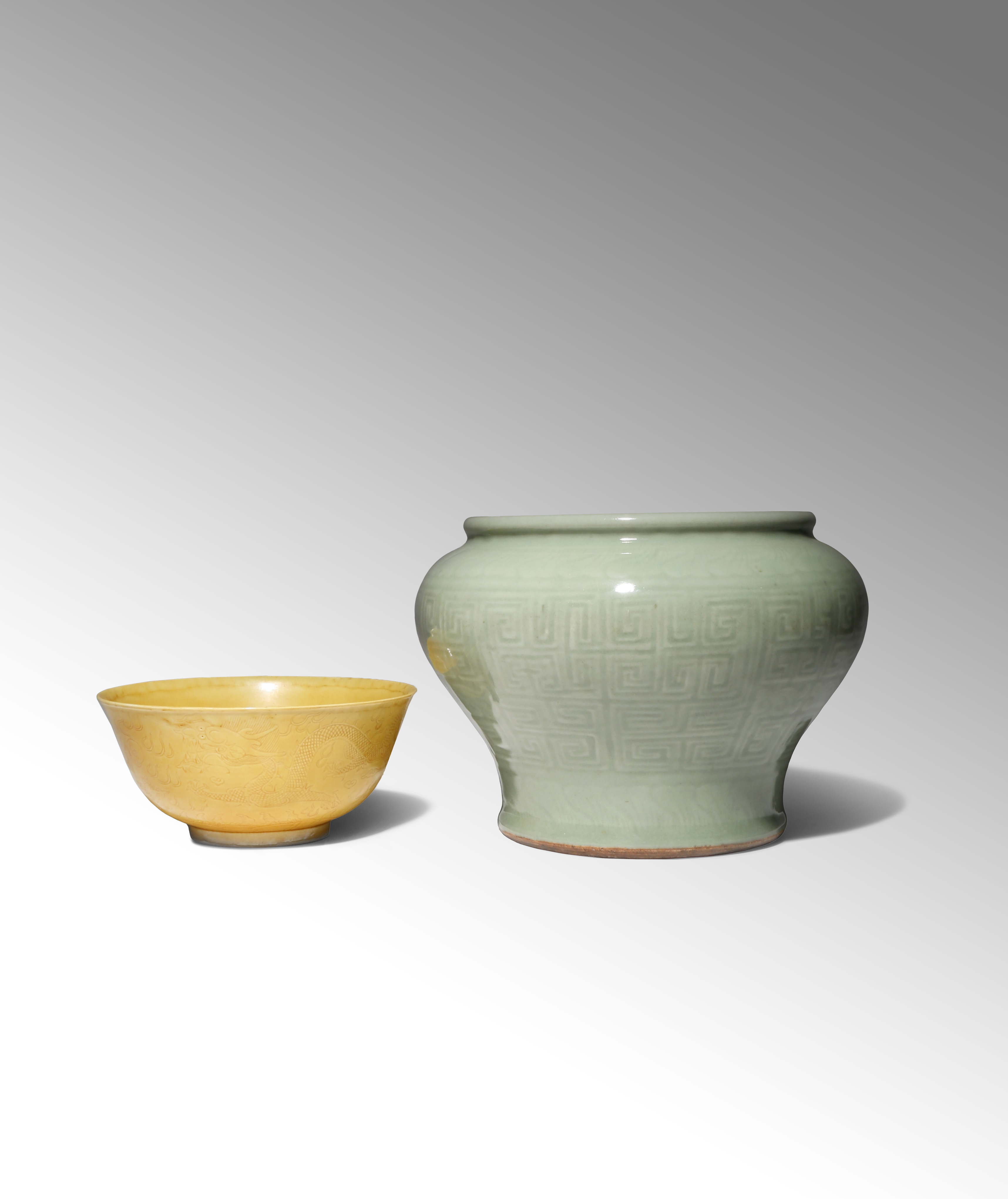 The exterior incised with two scaly dragons in pursuit of flaming pearls over a continuous band of crashing waves, coated with a warm egg-yolk yellow glaze, the base glazed white and with the reign mark in underglaze blue, together with a celadon glazed vase decorated with archaistic animal masks and geometric designs, the base with a four character Chenghua mark, 16.5cm and 22cm. (2)