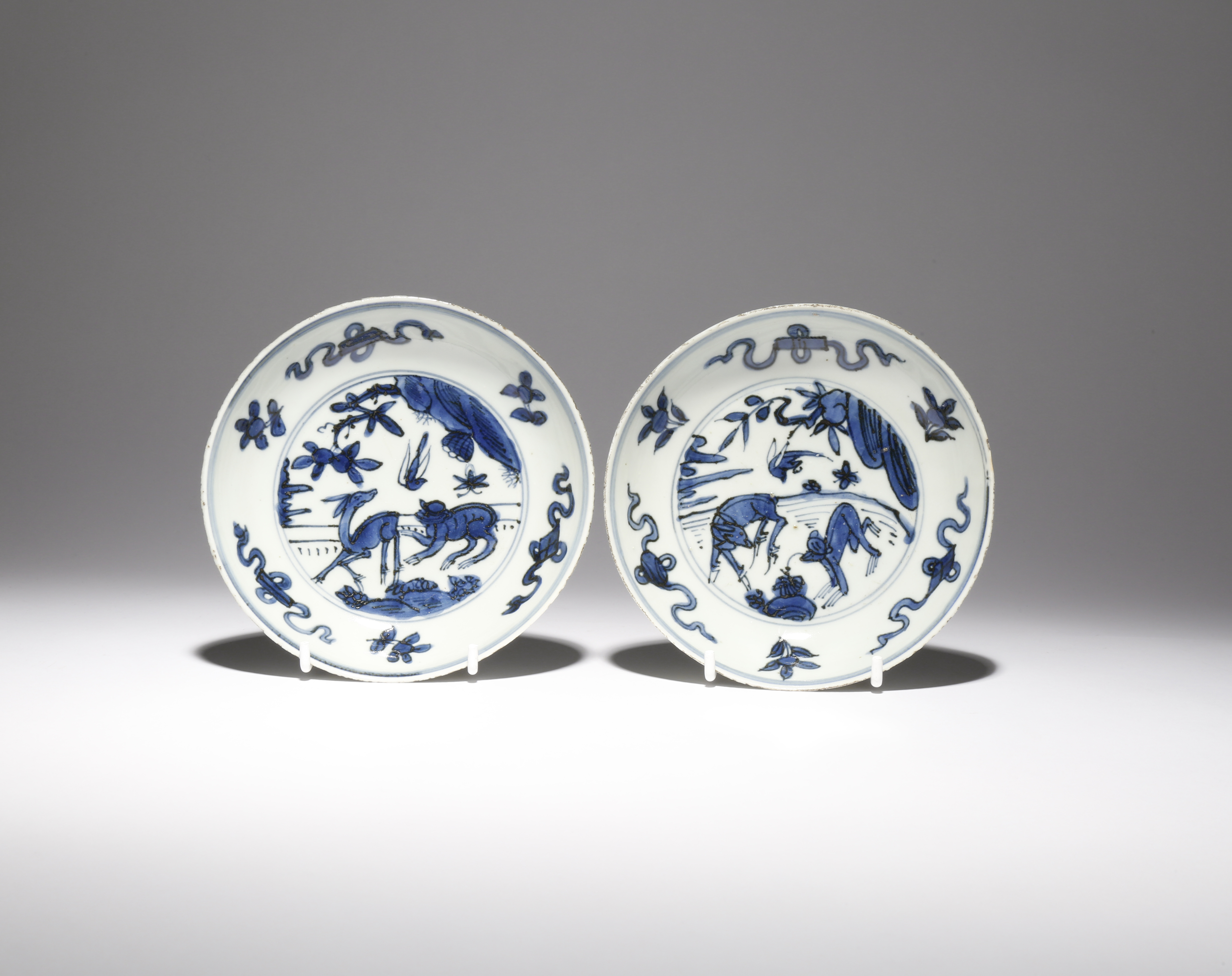 A PAIR OF CHINESE BLUE AND WHITE 'DEER AND MONKEY' SAUCER DISHES