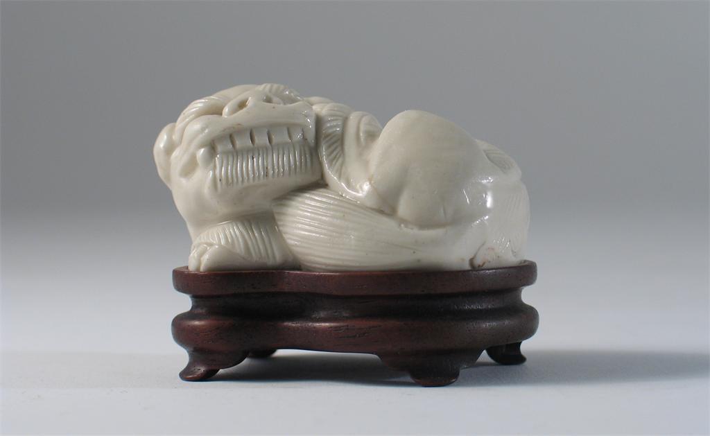 A Chinese white glazed model of a lion dog, recumbent and with a wood stand. A chip beneath the base. 18th/19th century, 6cm. (2)
