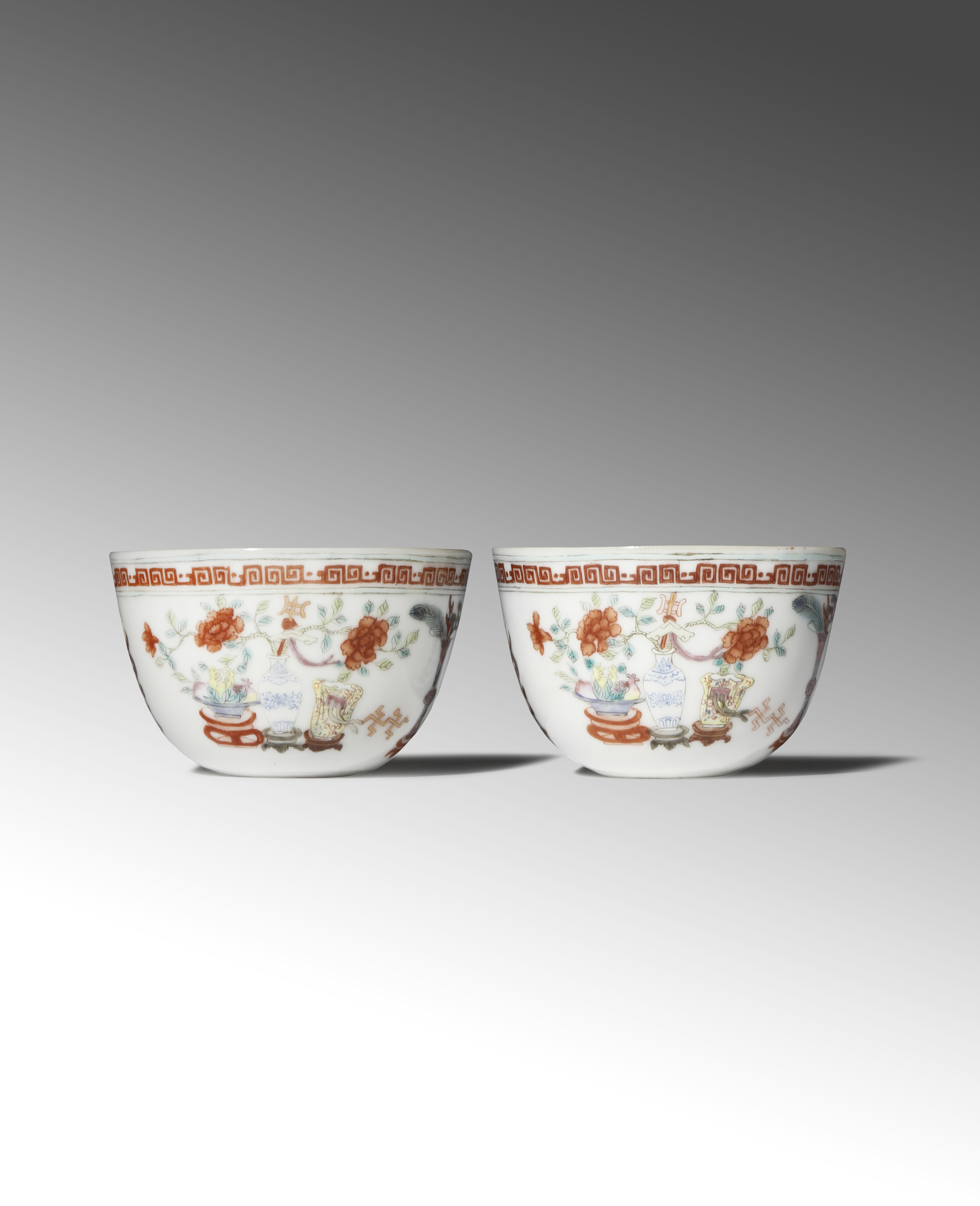 Decorated in enamels and gilt with many precious objects including archaistic vessels, books, flowers, the sanduo and peacock plumes, with geometric bands in iron-red encircling the rims, each with a recessed base, 6.3cm dia. (2)