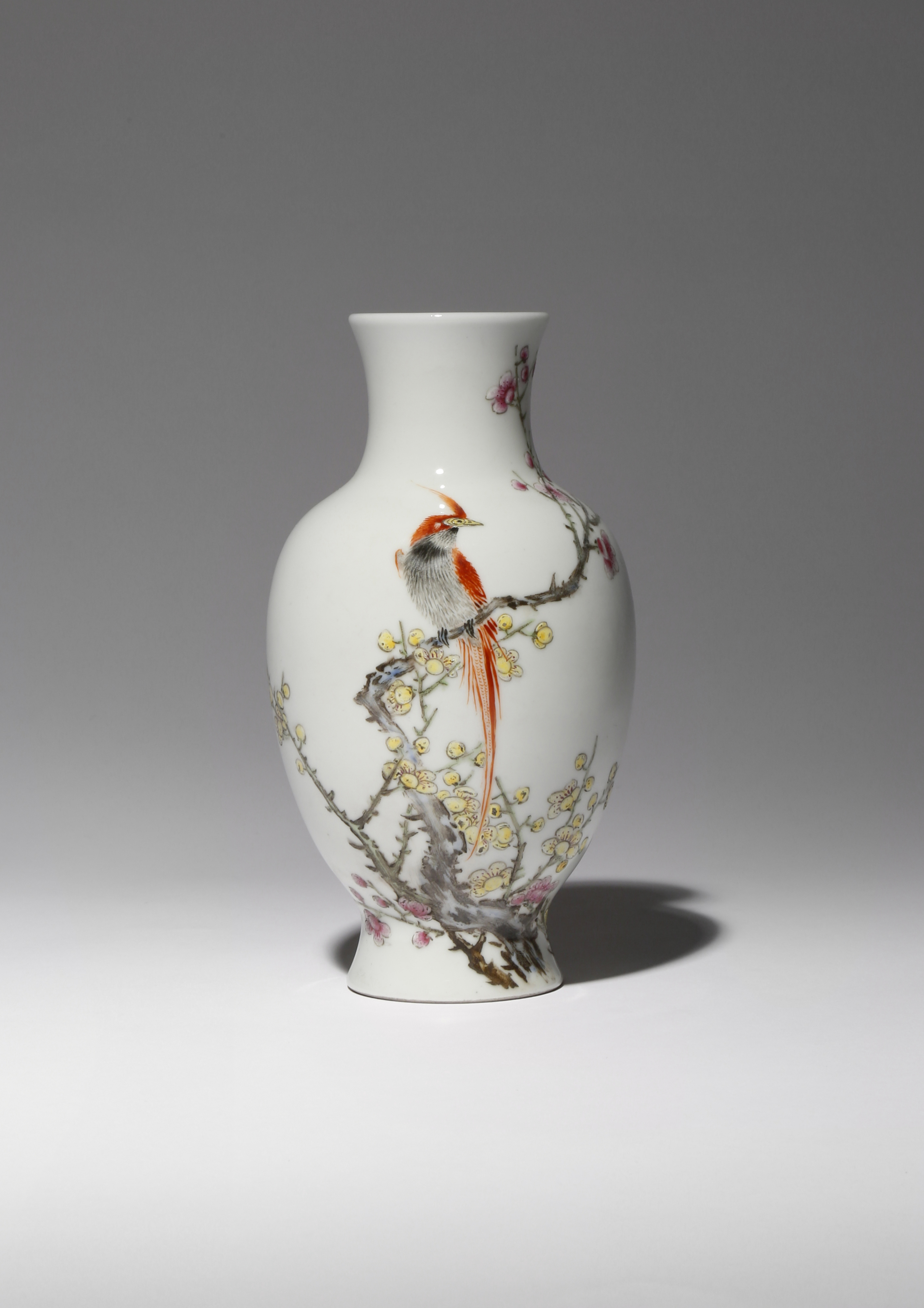 Painted with a crested bird perched on a blossoming prunus branch, inscribed with calligraphy, with a signature reading Botao for Bi Botao, the base with a six character mark which reads Nanchang Cheng Xingsheng zhi, 18.7cm.