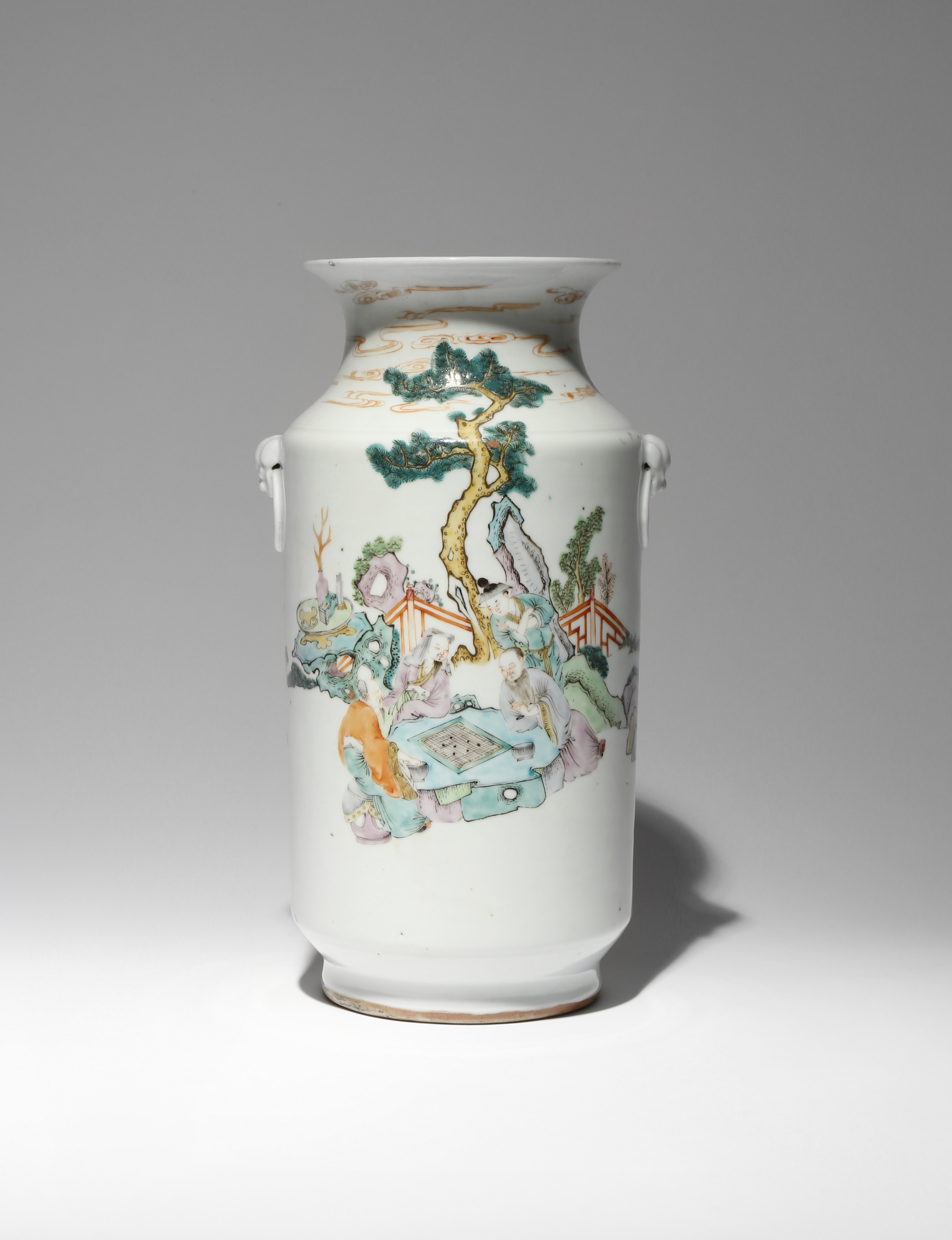 The cylindrical body painted with intellectuals in a landscape conversing and playing go, with rocks, pine and wutong trees around them, the waisted neck decorated with the sun amidst wispy clouds, with two applied animal mask handles to the sides, 33cm.