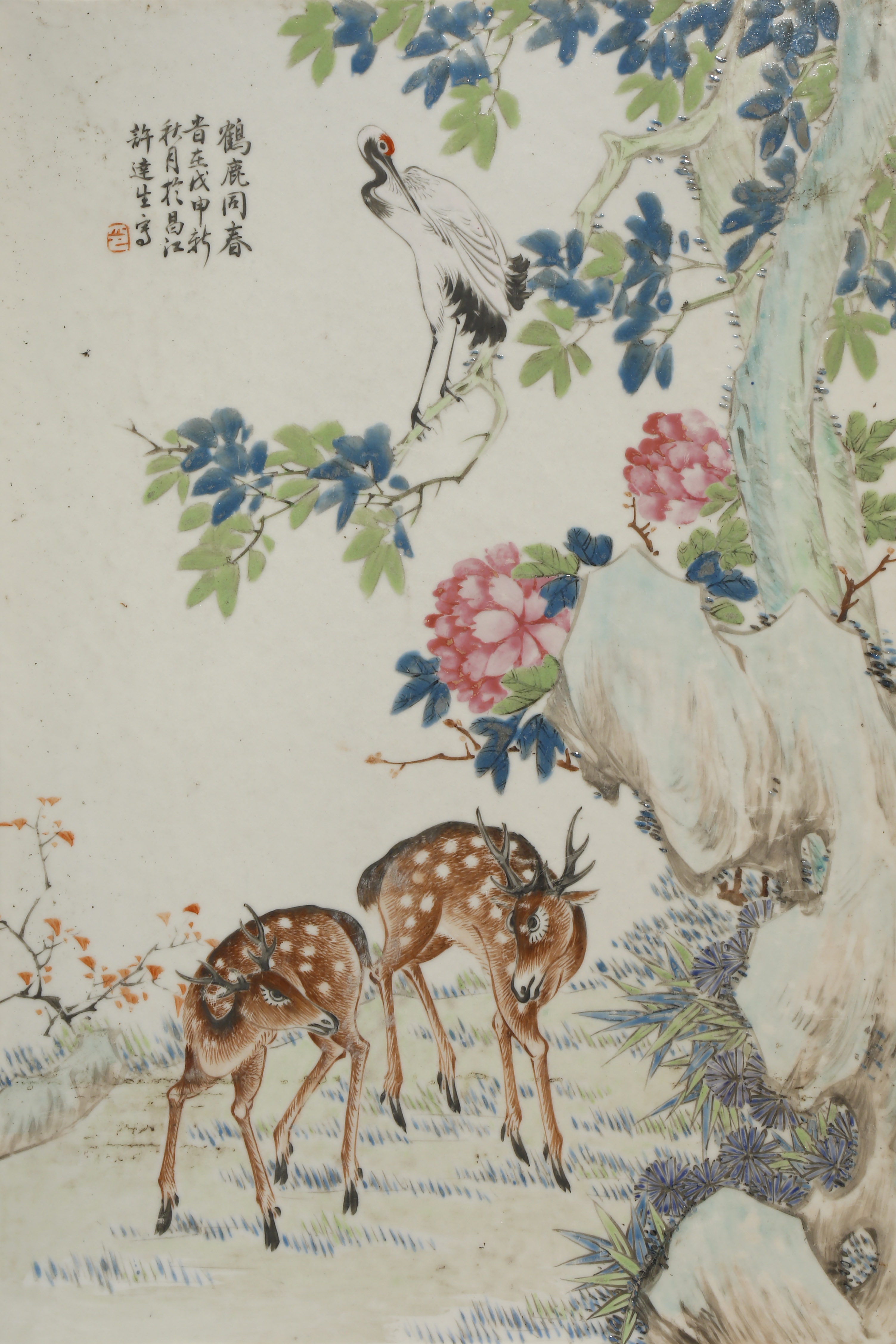 A CHINESE FAMILLE ROSE PORCELAIN RECTANGULAR 'CRANE AND DEER' PLAQUE