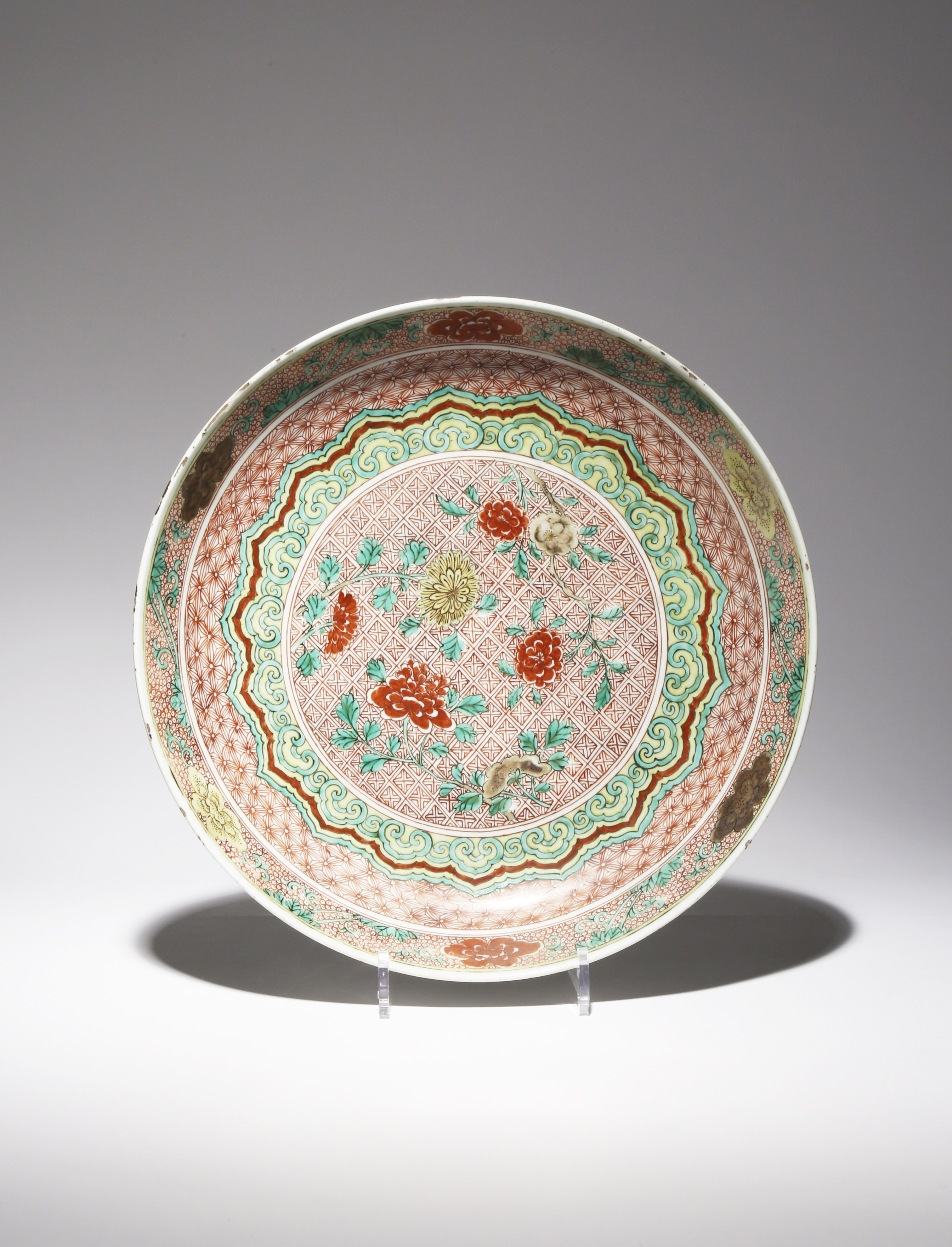 Painted to the centre with peony and chrysanthemum blooms reserved on diaper, the design encircled by ruyi-heads, with a band of further flowerheads to the rim, the base with a faded paper label, 35.2cm.
