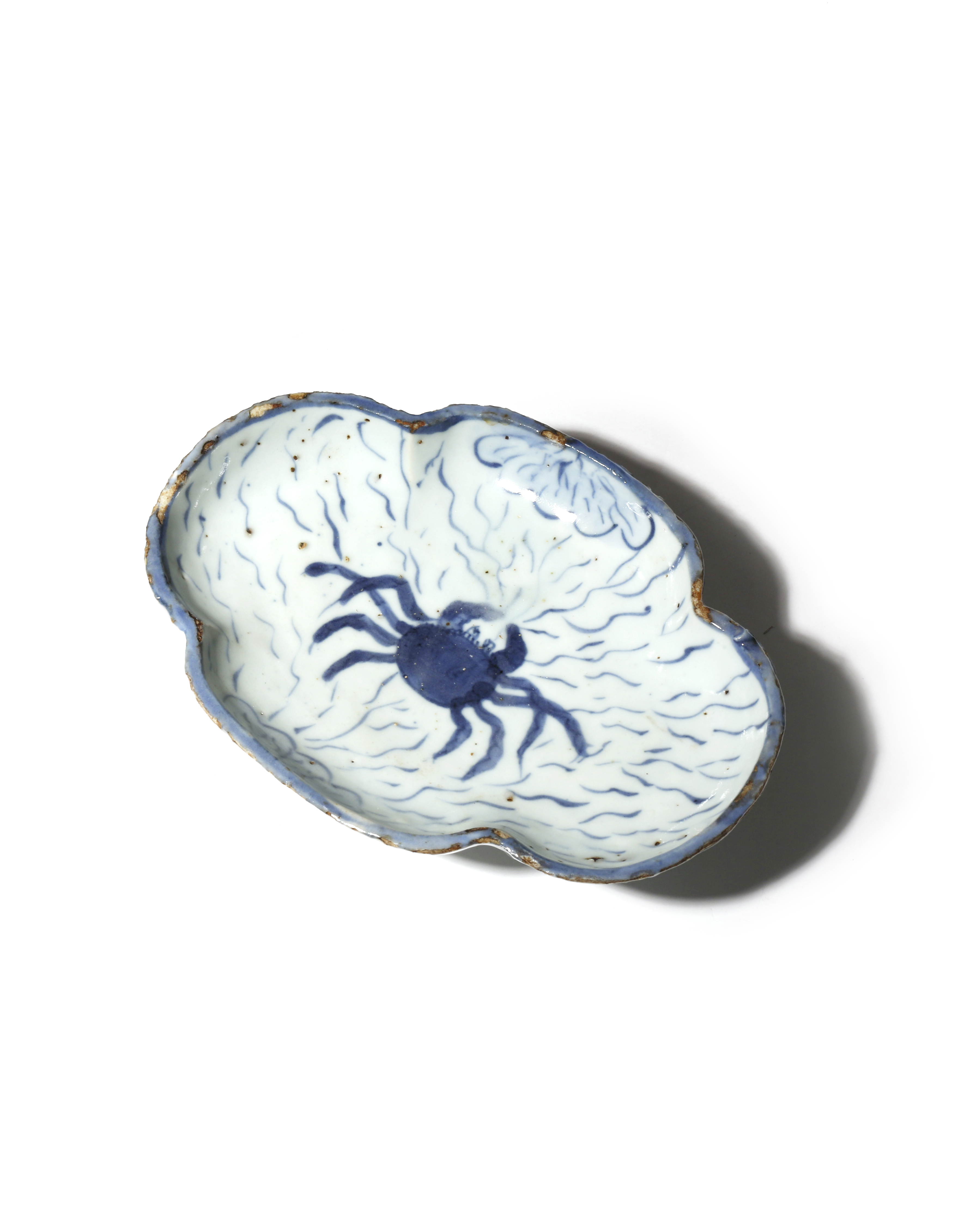 Of quatre-lobed form, painted with a crab amongst stylised waves and seaweed, raised on four short feet and with a typical mushikui (insect-nibbled) rim, 16.5cm.