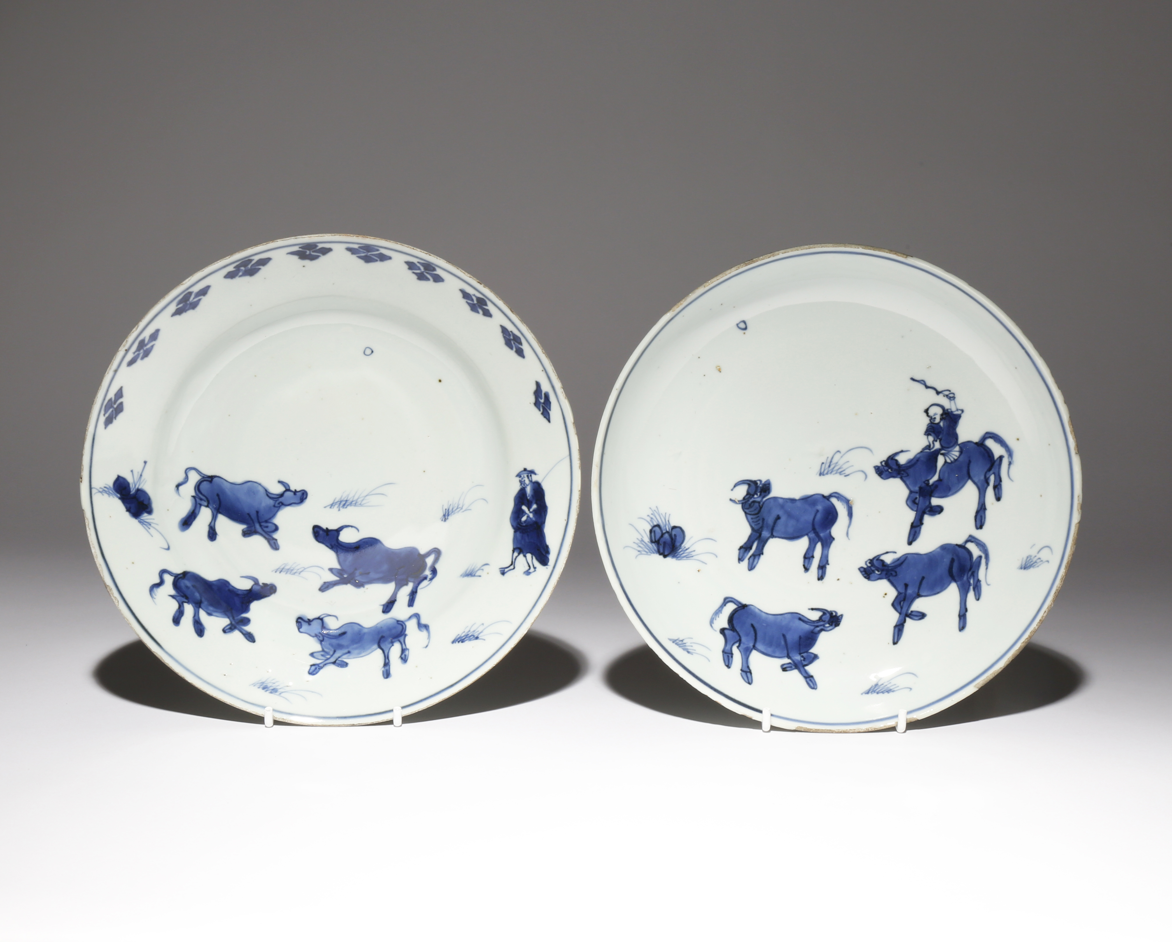 Both decorated in underglaze blue with a buffalo herder and four oxen, one dish with a band of ten rhomboids above following the rim, with tendrils to the undersides, both approx. 21cm. (2)