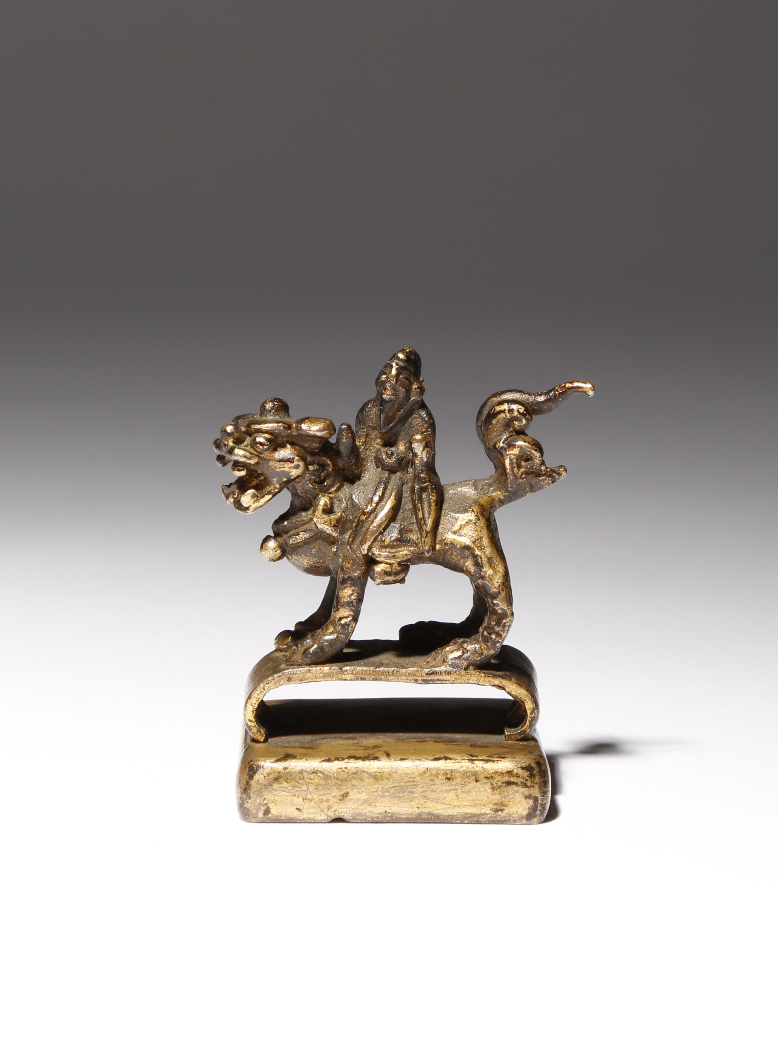 Cast as an Immortal riding a lion dog, haetae, the sage turned to the left and wearing long robes, the mythical beast with a large bell hanging from its collar and raised on a scroll-shaped plinth, on a square base cut to the underside with three large characters, 5.5cm.