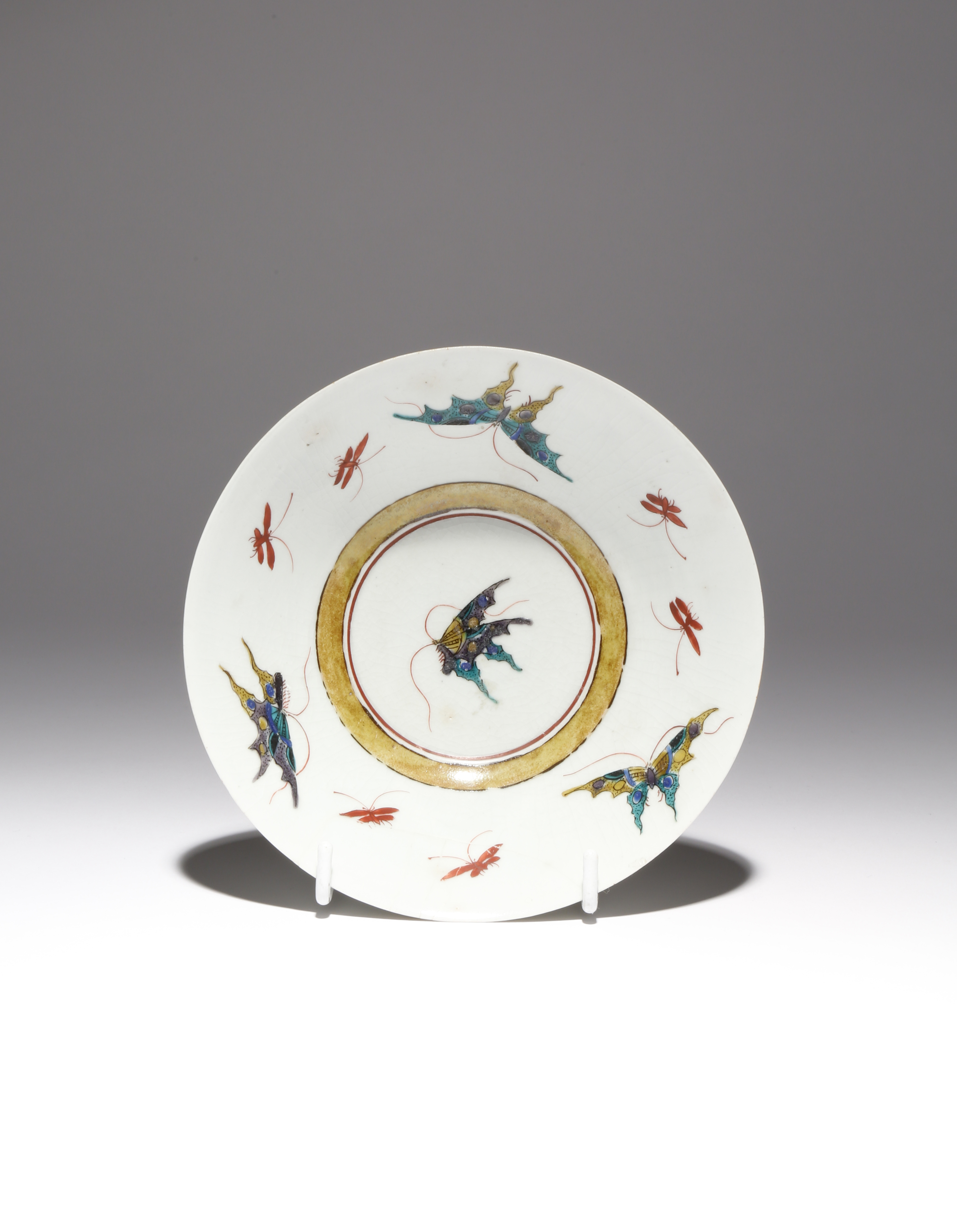 Decorated in purple, yellow, green and blue enamels and overglaze iron-red with four large butterflies fluttering across the well, with smaller red insects flying around them, the underside painted with three further butterflies and red insects, with circular rings encircling a fuku mark to the centre of the base, 15cm dia.