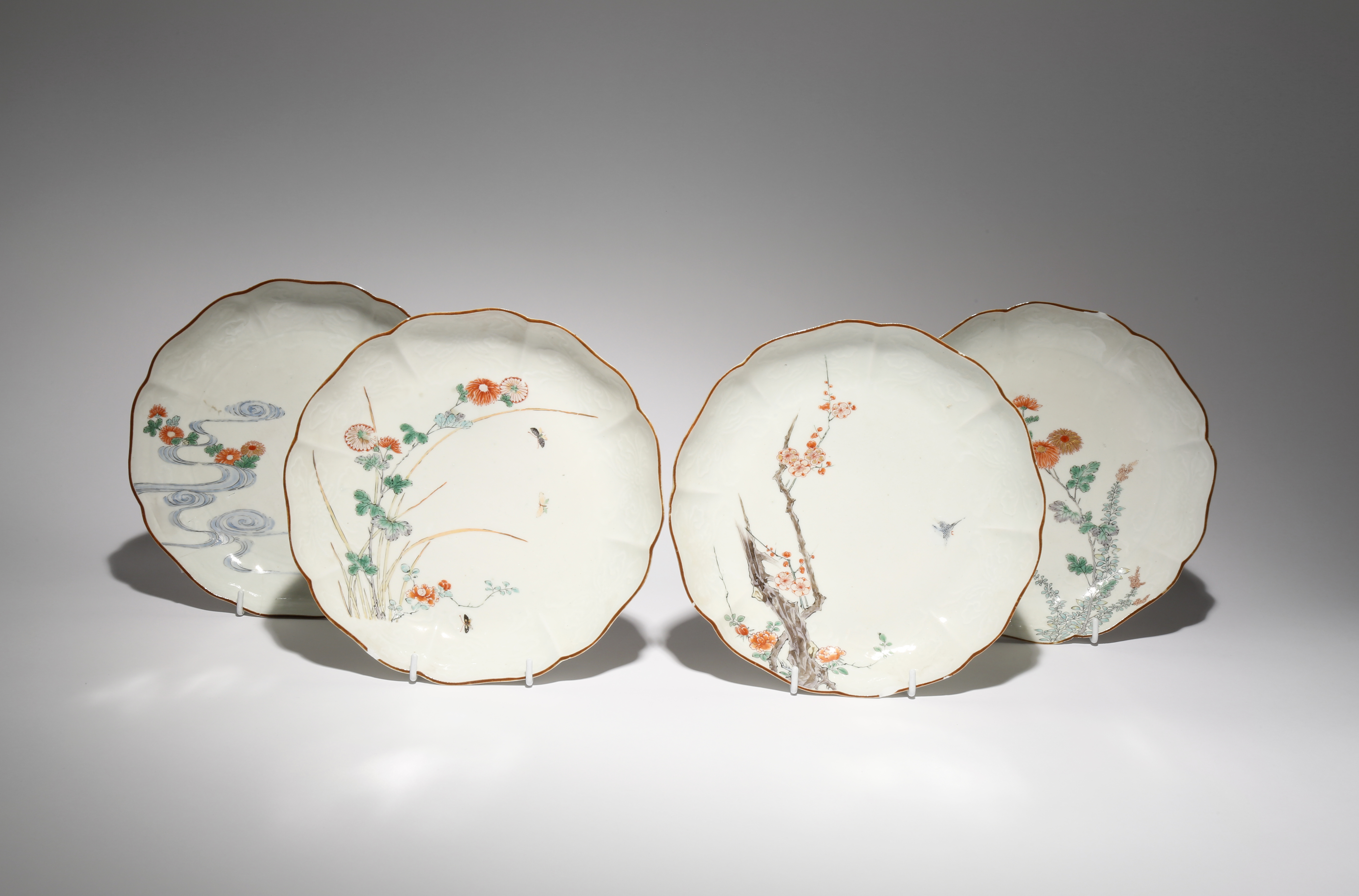 Each of lobed form, the cavetto moulded with lotus flowerheads and decorated to the well in overglaze enamels, two dishes with sprays of chrysanthemum, another with a small blue bird flying over a branch of flowering prunus, and the fourth decorated with chrysanthemum flowers floating on the surface of a meandering stream, all approx. 22.5cm. (4)