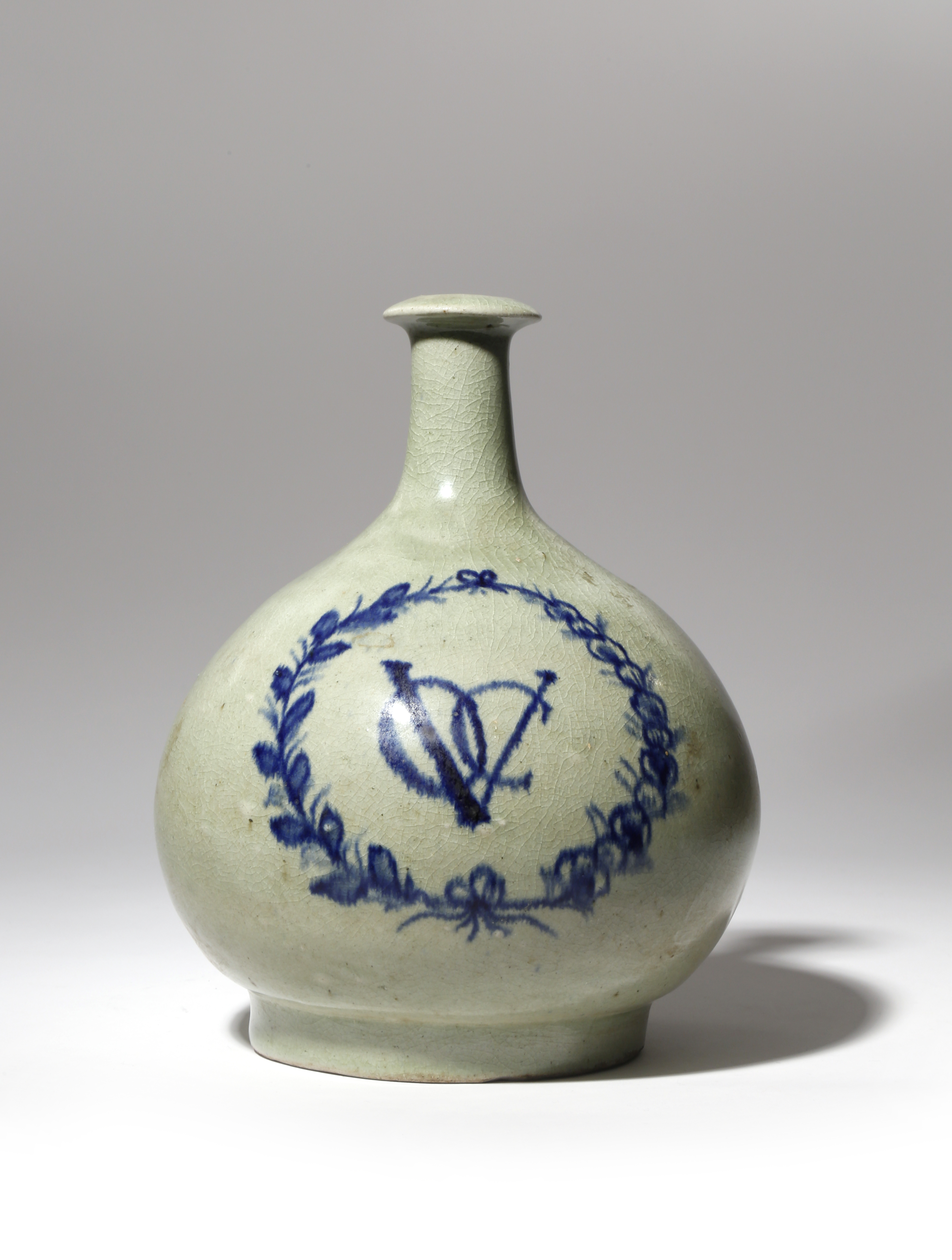 The gallipot-shaped body decorated in underglaze blue with the monogram 'VOC' for the Vereenigde Oostindische Compagnie (Dutch East India Company) framed by a crown of leaves and flowers, on a celadon-grey ground, the base with the VOC monogram, 22cm.