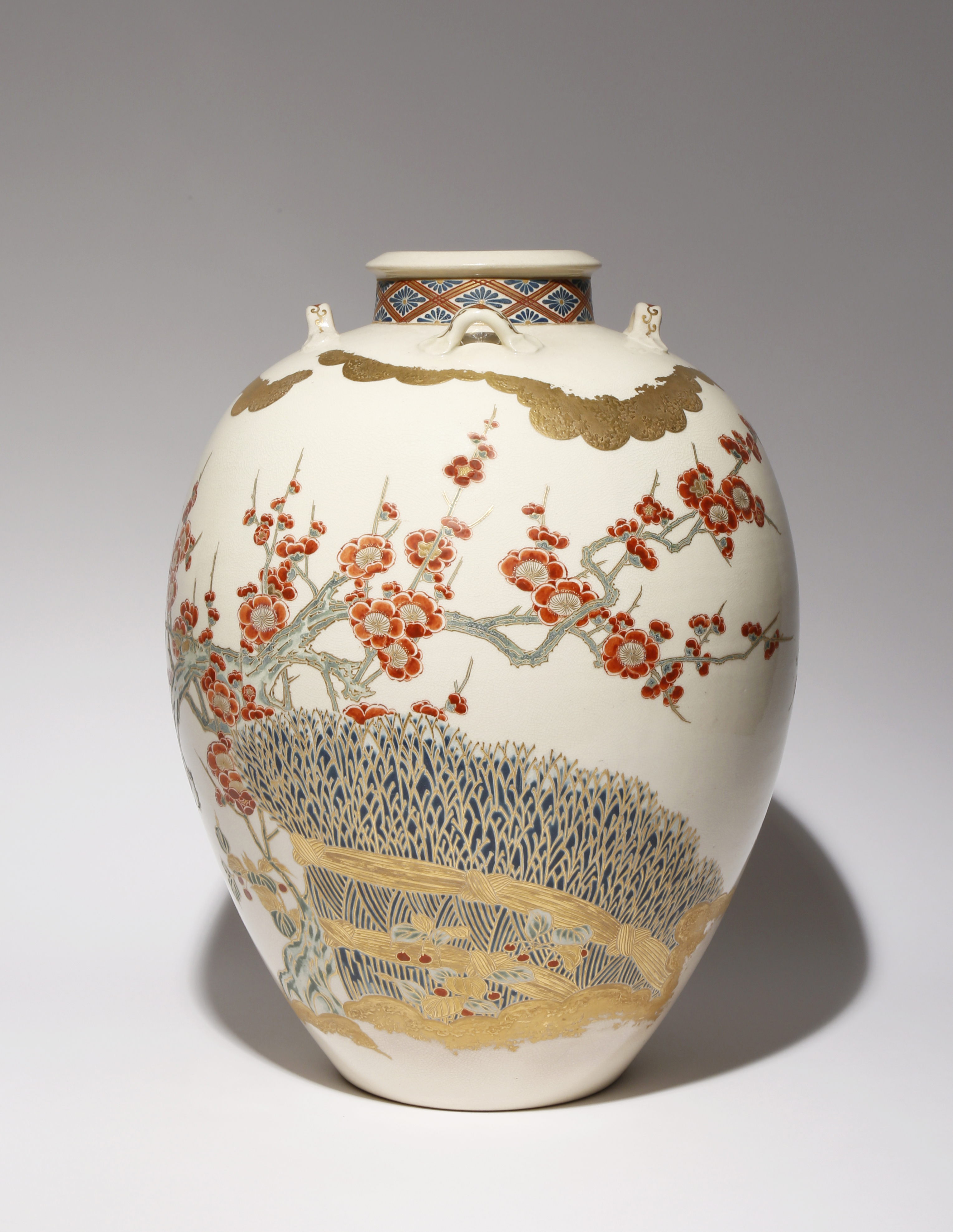 The tall ovoid body rising to a short neck with four small handles applied to the shoulder, decorated with a continuous design of flowering prunus trees growing from behind banded hedges, with gold scrolling clouds above, the neck with a band of chrysanthemum flowerheads in rhomboids, 42.5cm.