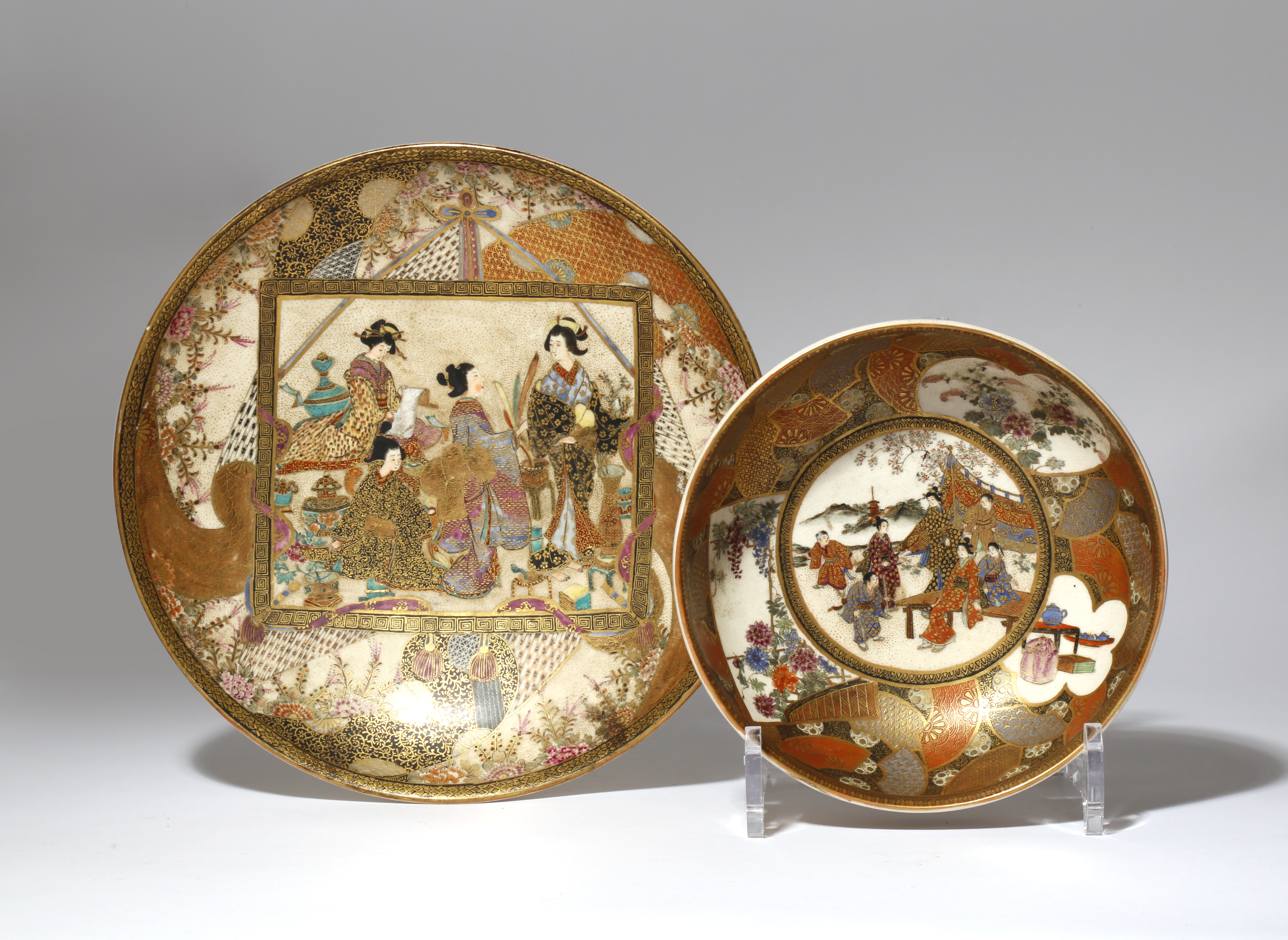 The plate with a central rectangular panel of beauties engaged in daily activities and the cavetto with geometrical brocade patterns and flowers, signed; the bowl with a central medallion of figures in a garden, with further panels of flowers and auspicious objects on a ground of geometrical patterns, the underside with bands of chrysanthemum and maple leaves, signed Kozan, 21.8cm max. (2)