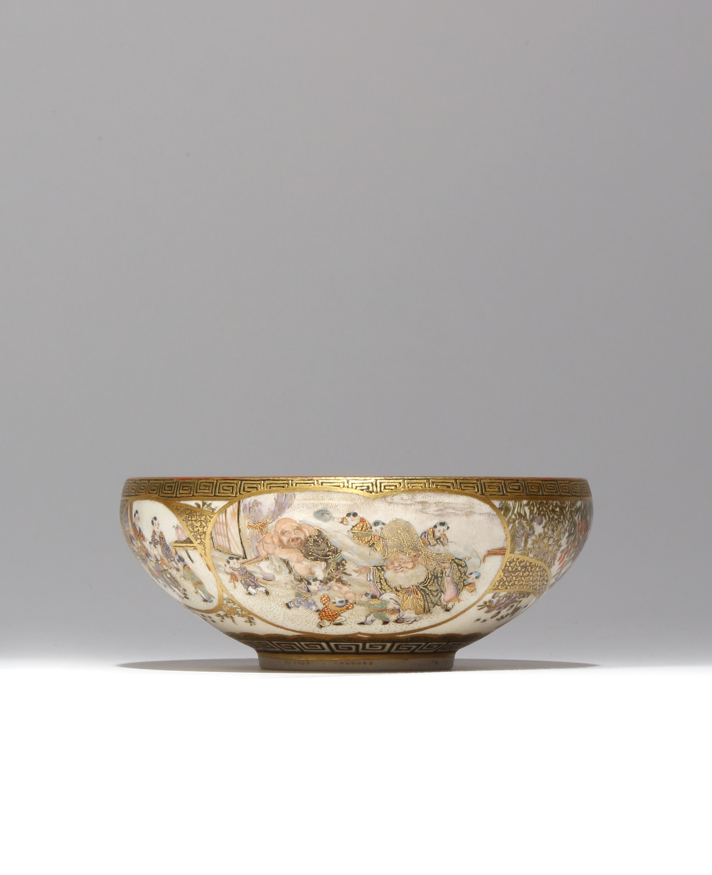 The well decorated with a multitude of flowers, birds and butterflies, the outside with further blooms and two panels enclosing the Gods of Good Fortune Hotei and Fukurokuju playing with many children, the base signed Fujisan, 12.7cm.