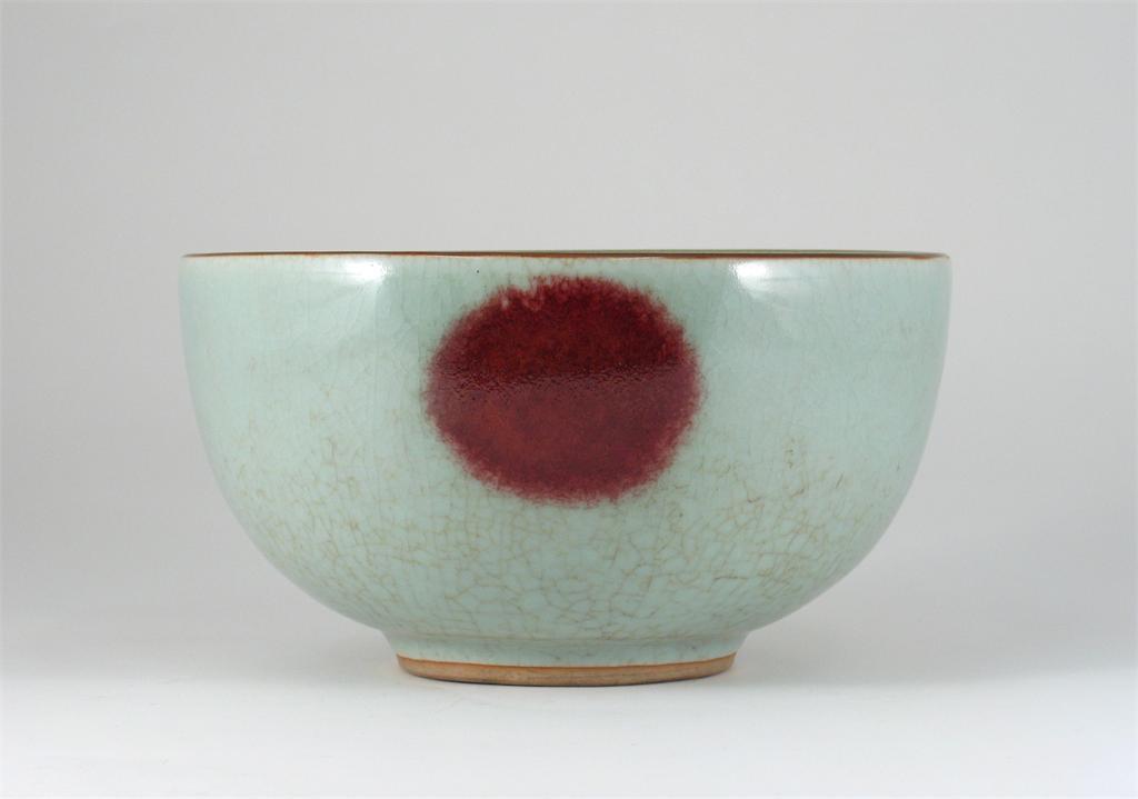 A large Chinese crackle glazed bowl, decorated with three iron red spots, 19th century, 25.5cm.